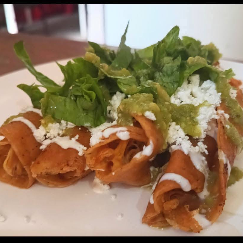 Tortilla dorada con pollo deshebrado, cubierta de crema, queso, lechuga y salsa al gusto.