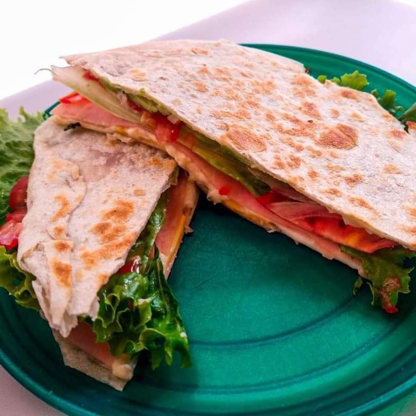 Tortillas de harina con una cama de jamón, queso amarillo, queso Oaxaca gratinado lechuga, jitomate, cebolla y aguacate.. De picantes puede ser rajas, salsa valentina o chipotle.