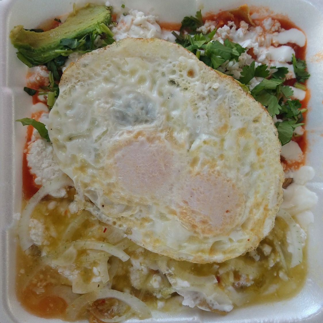 Totopos bañados en salsa de preferencia con dos huevos, con crema, queso y verduras de preferencia.