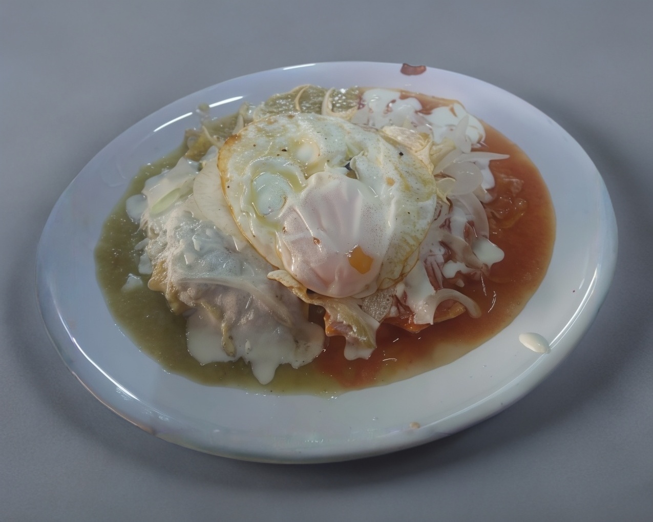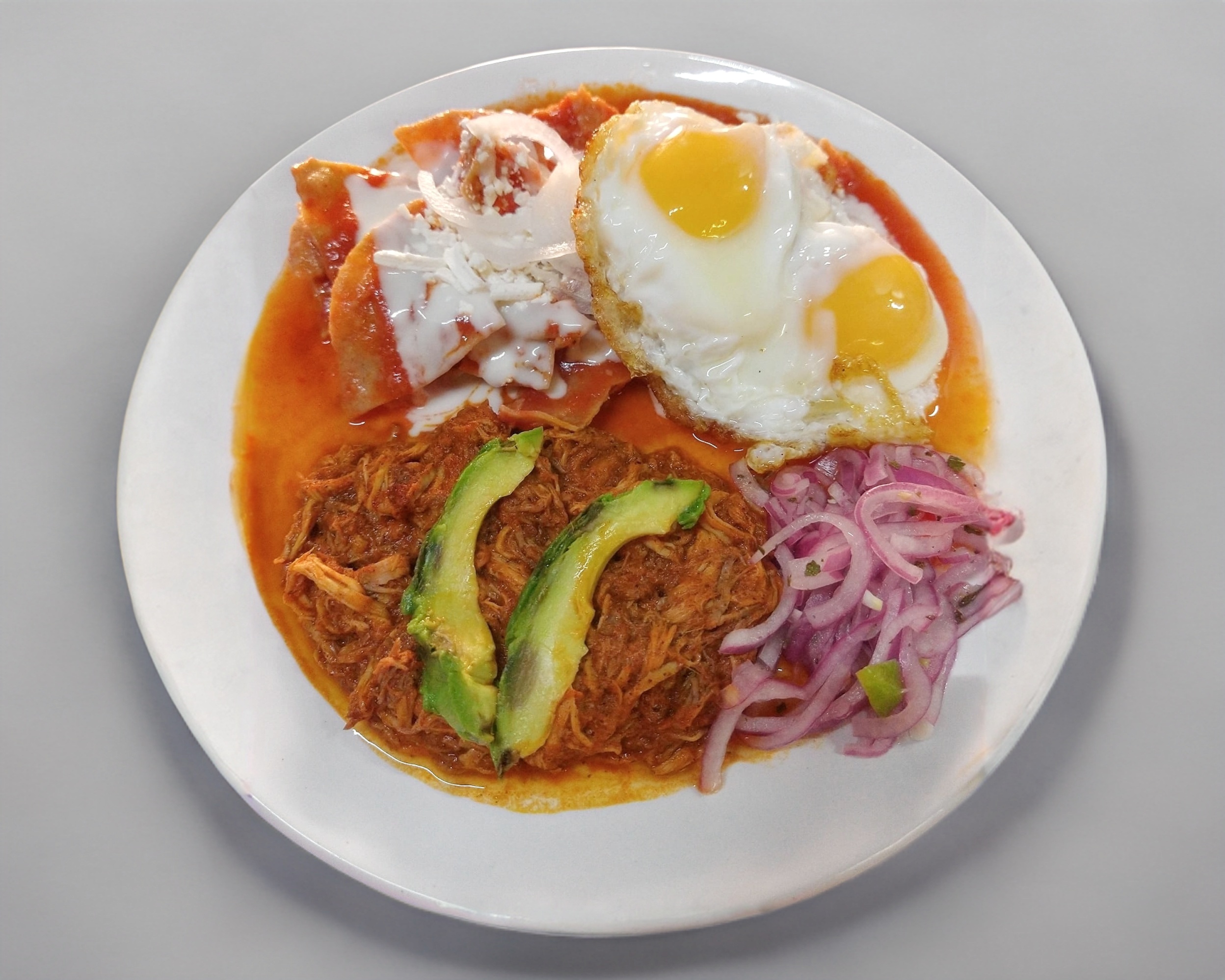 Totopos de maíz con cebolla, crema y queso rallado, bistec, preparación a elección.