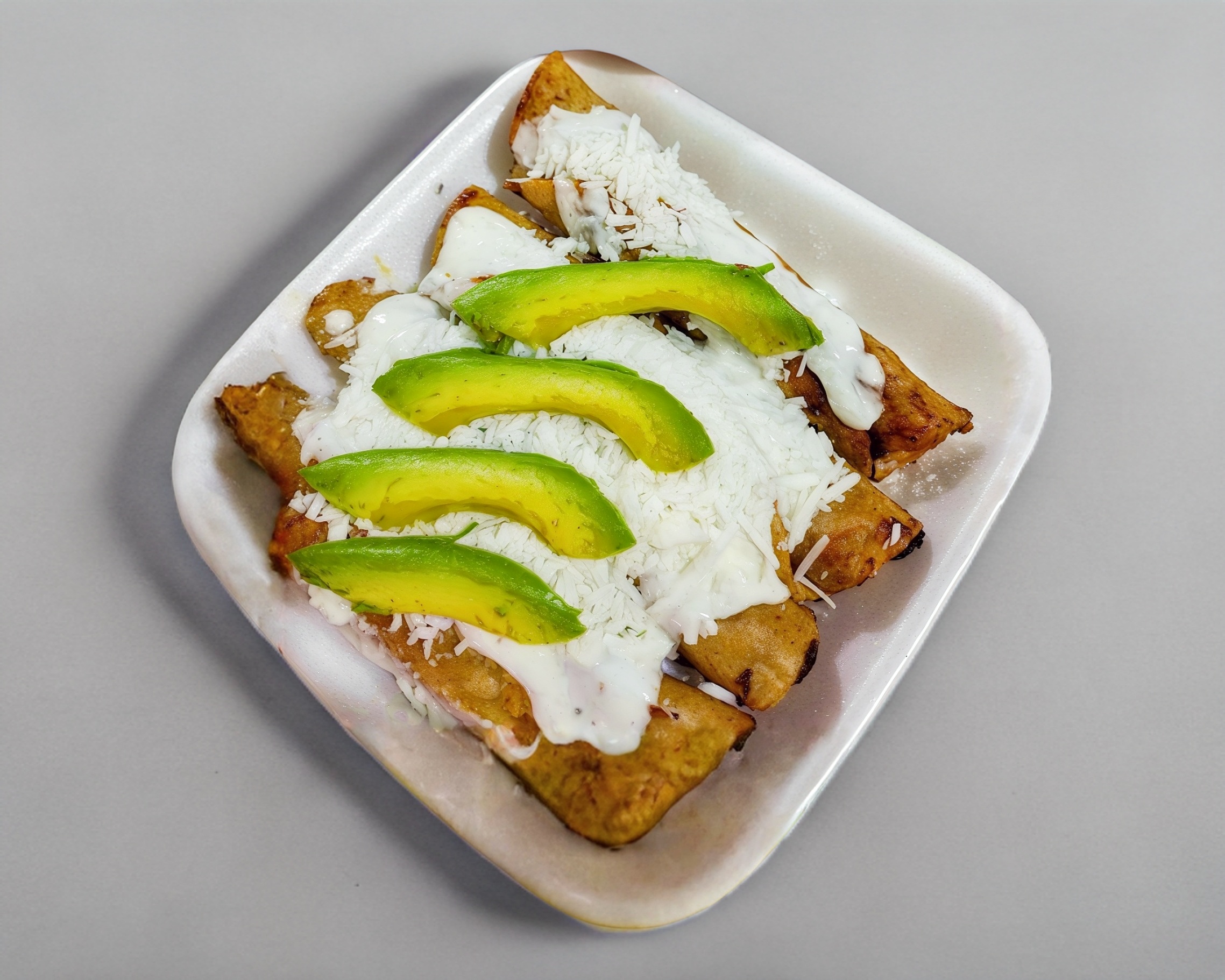 4 tacos de pechuga de pollo deshebrada, acompañada de crema queso y aguacate