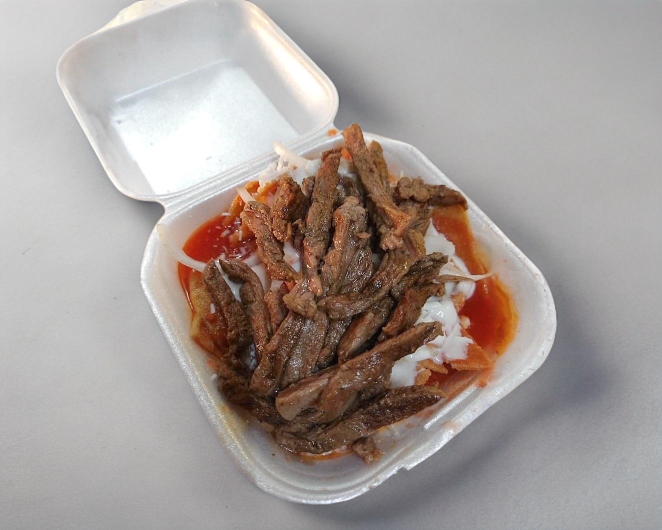 Pan bolillo con crema, cebolla, queso rallado, bistec, totopos de maíz, preparación a elección.