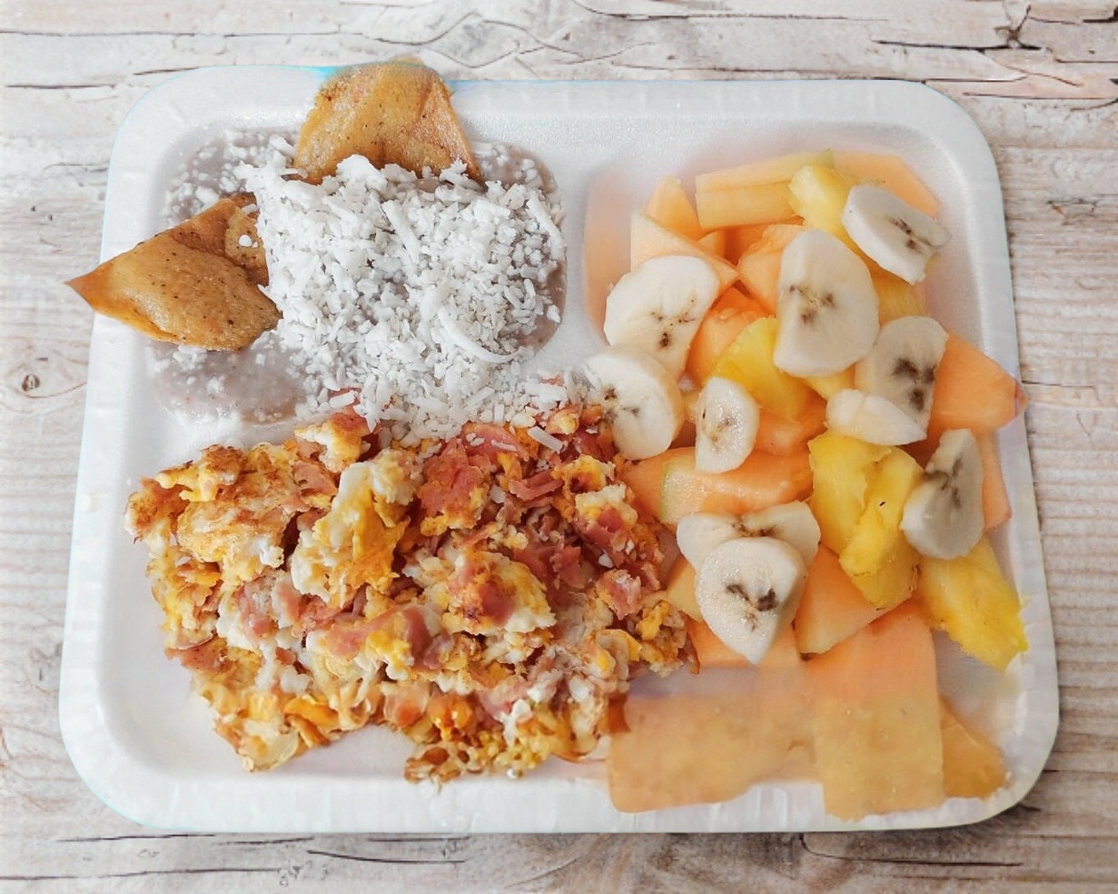 Huevos con proteína a elegir, fruta de tu preferencia, frijoles, café y bolillo. (Porción personal)