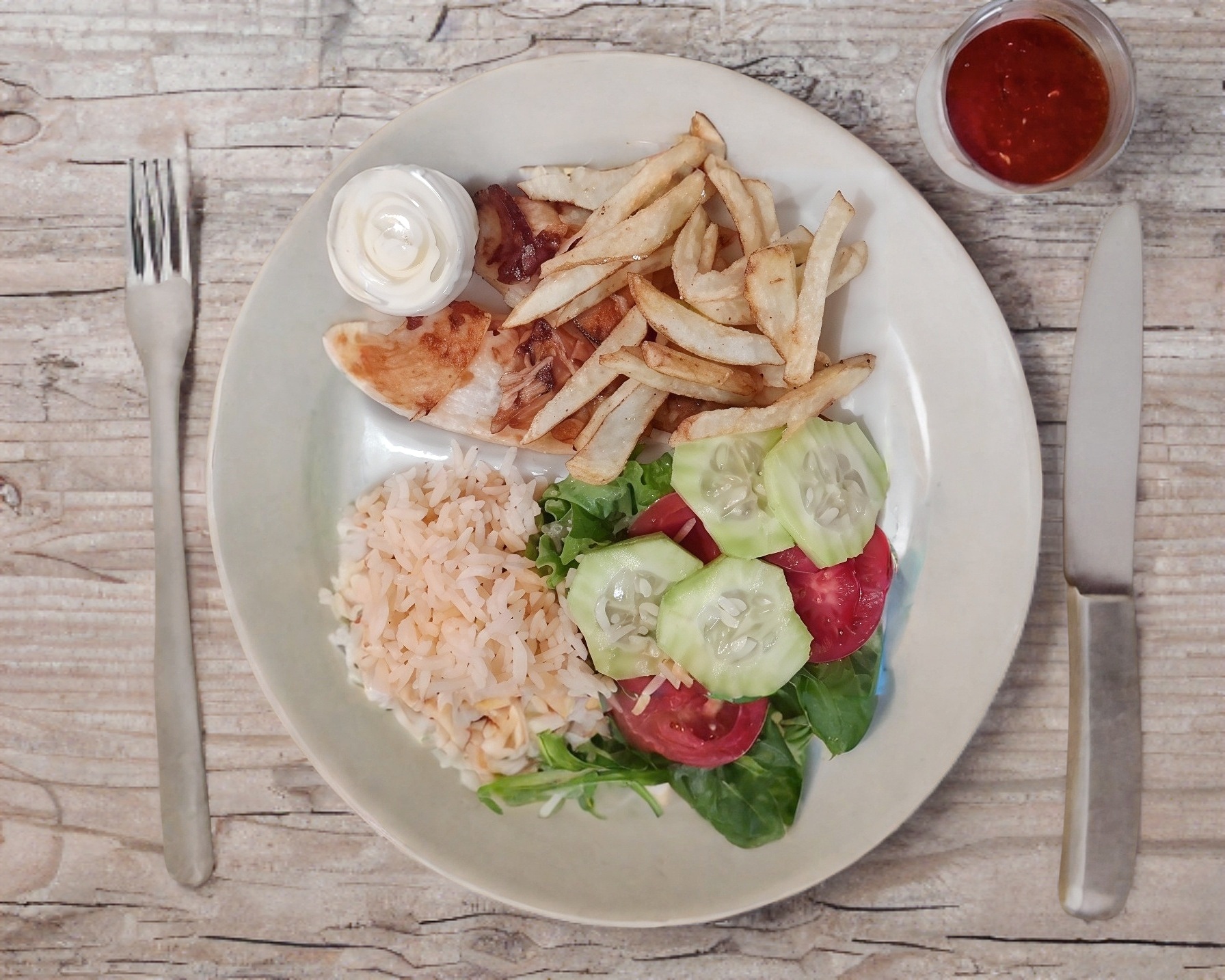 Lechuga,jitomate,cebolla,chile, mostaza,capsu pechuga azada orden de papas fritas