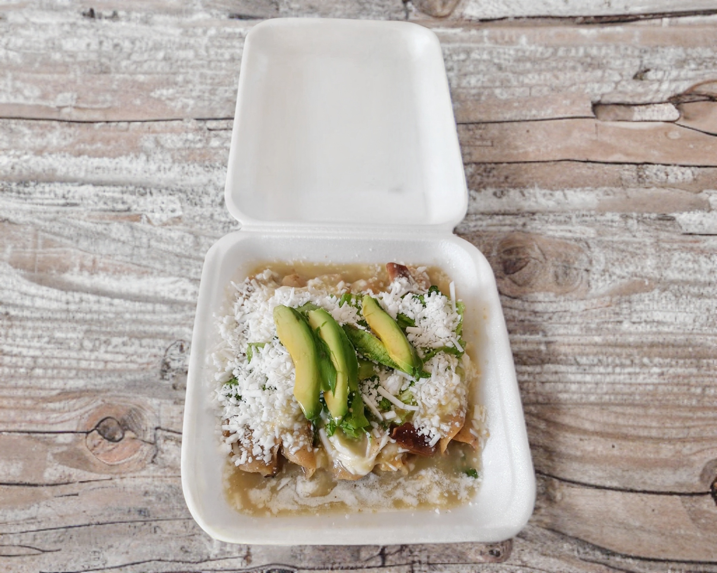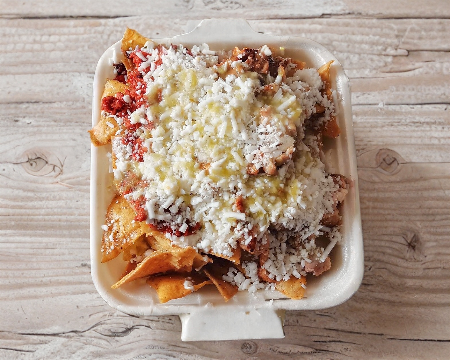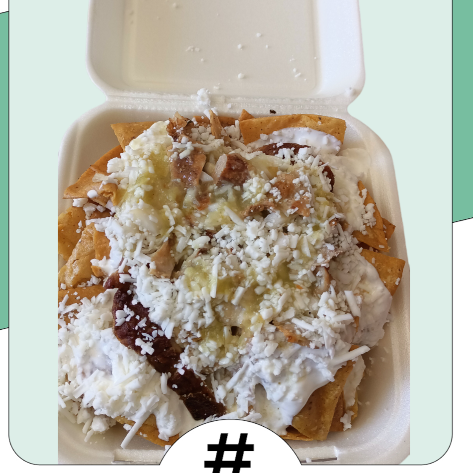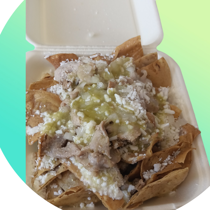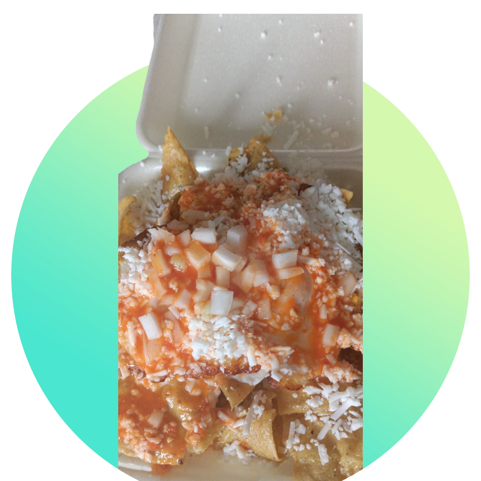 Totopos bañados en salsa verde crema queso rayado y cebolla bolillo