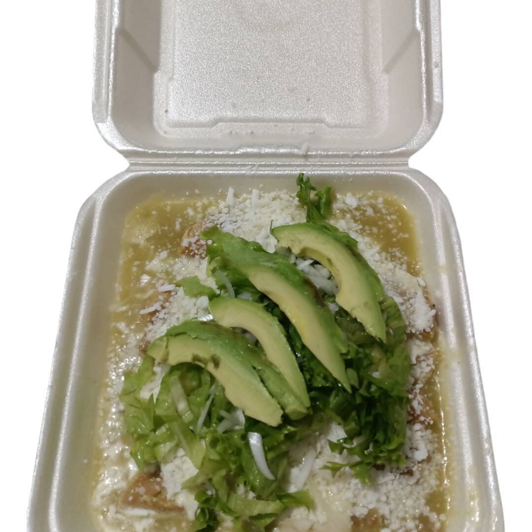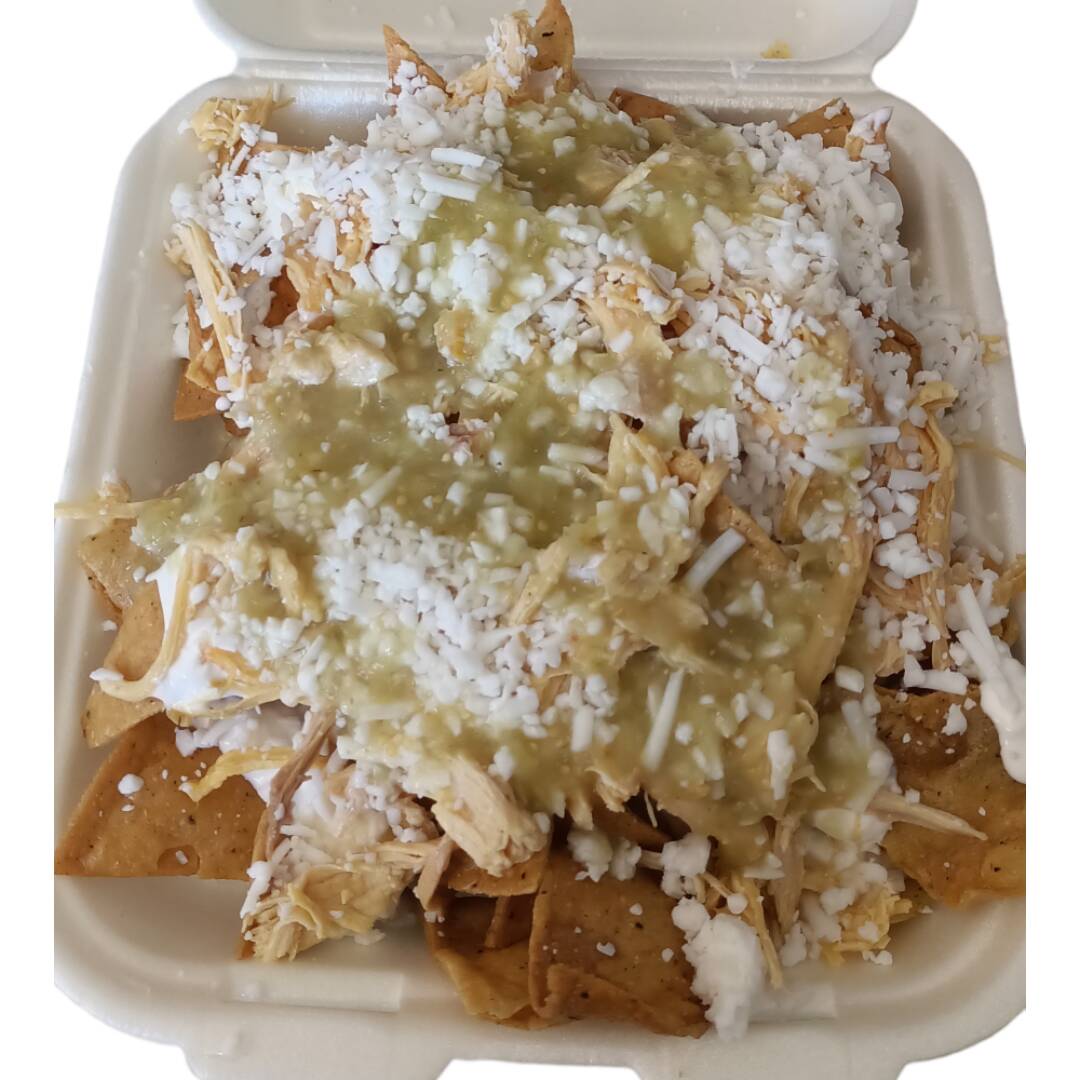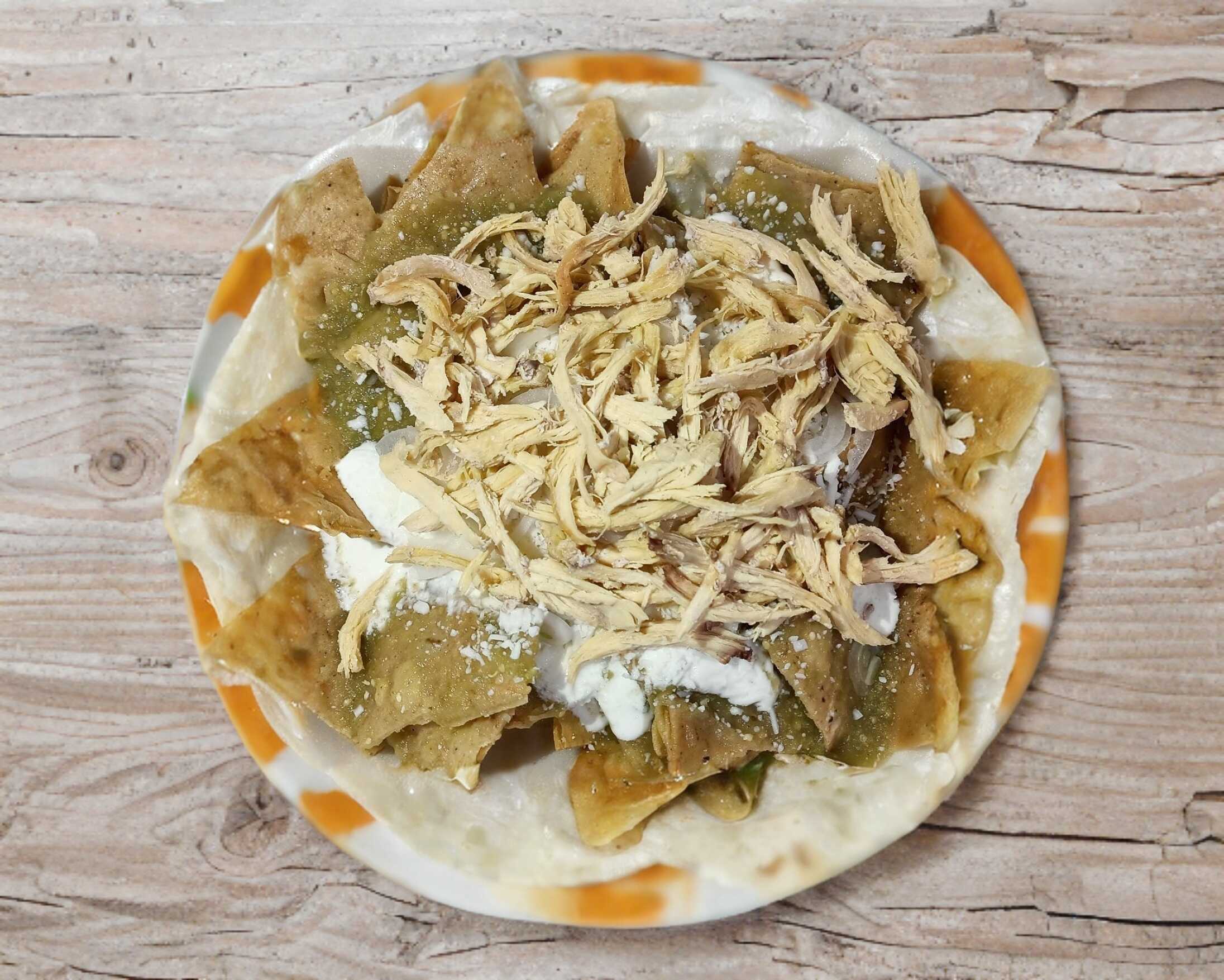 Pollo deshebrado 250gr, totopos de maíz, bañados en salsa verde, crema, queso rayado y cebolla. (Porción personal)