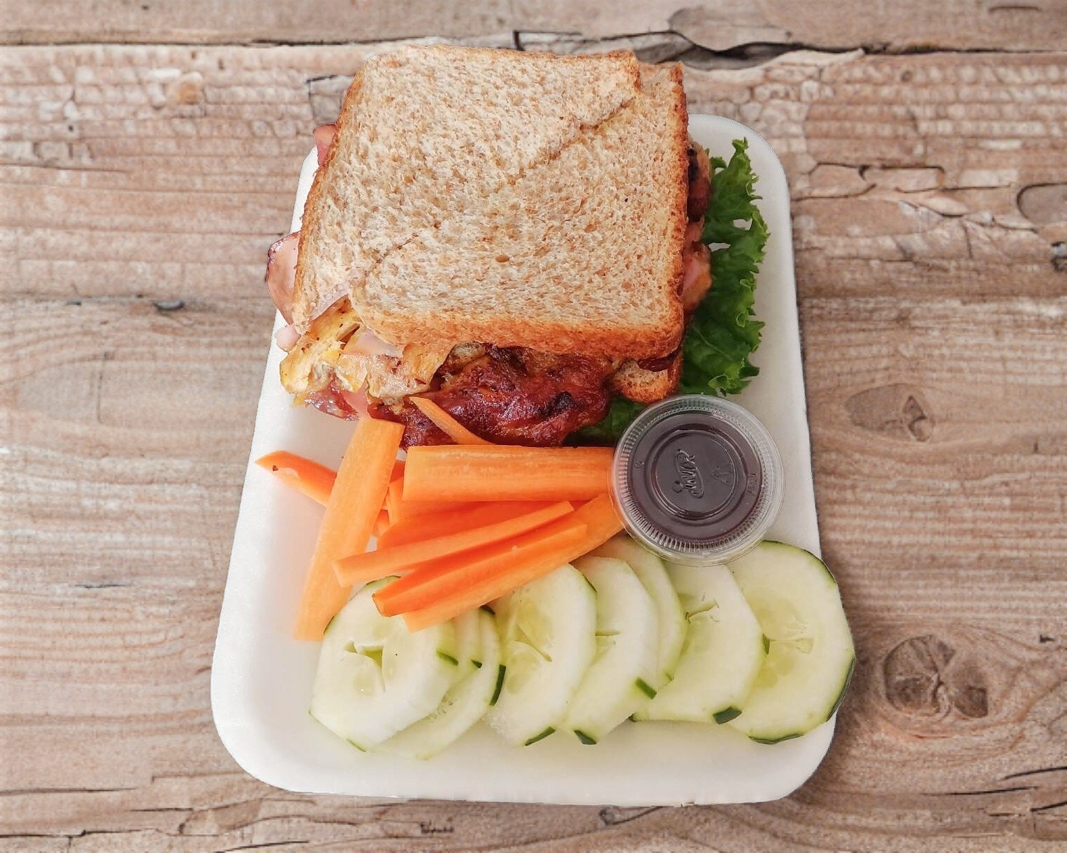 Tocino pollo, jitomate lechuga, jamón queso amarillo, pepino y zanahoria