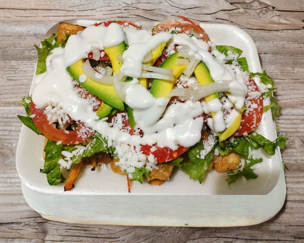Totopos con salsa de chipotle bistec, crema, queso rayado cebolla,