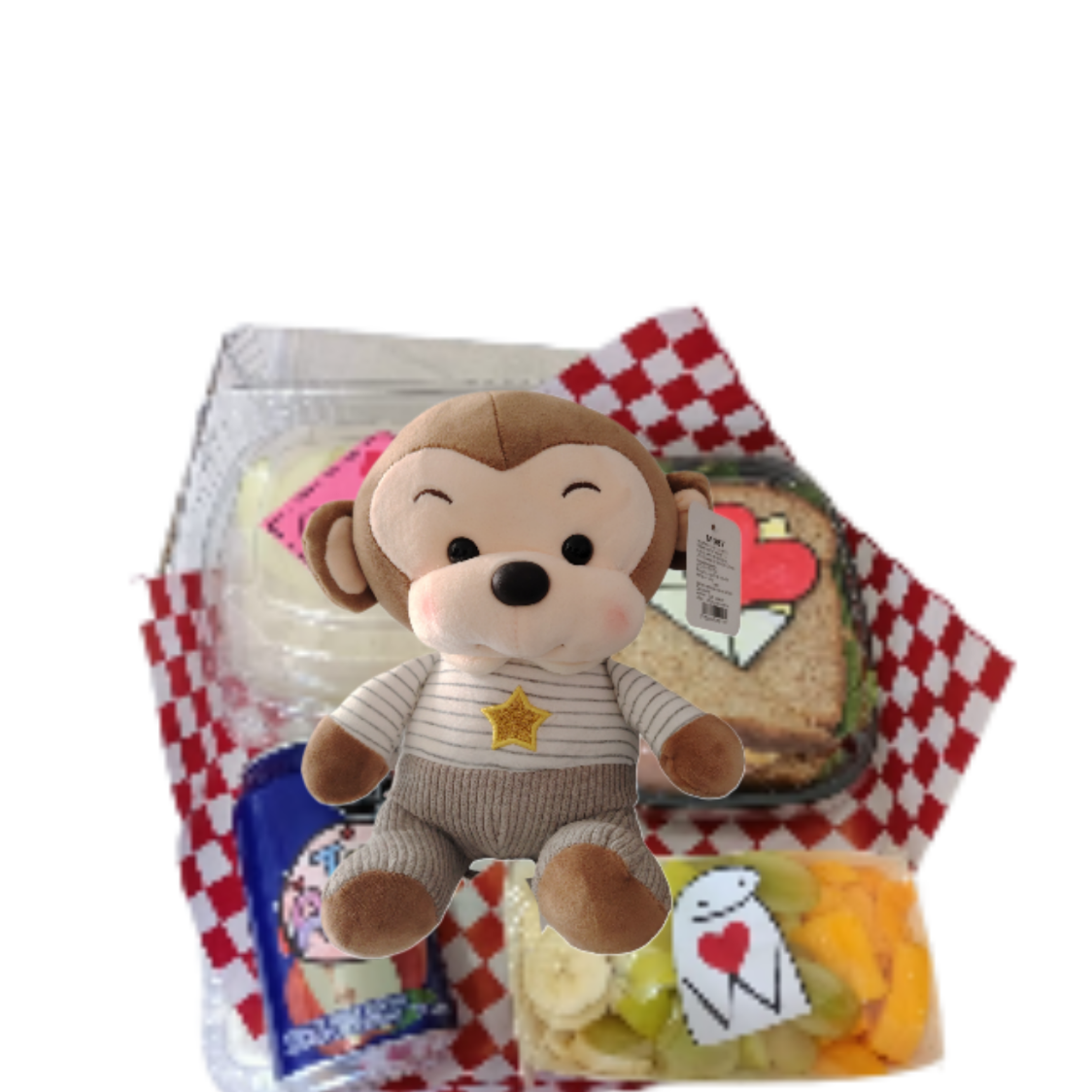 Oso de peluche varios modelos colores disponibles 1 sandwich de pollo 3 panes, 3 wafles con frutilla ,platano fresa , manzana lechera 1 jugo de lata mensaje( feliz cumpleaños ) , (te amo ),(Feliz dia del niño), (Feliz dia de la madre )
