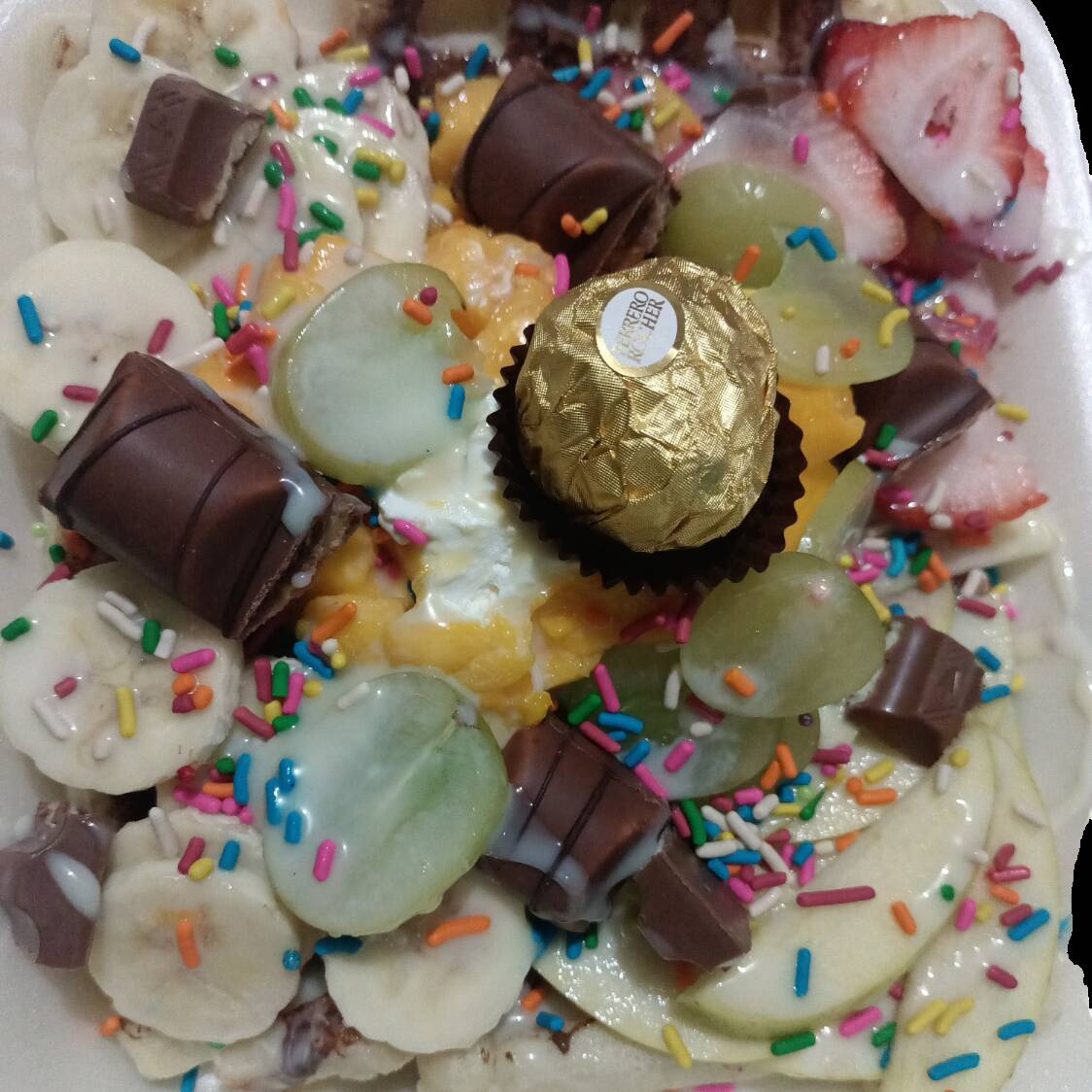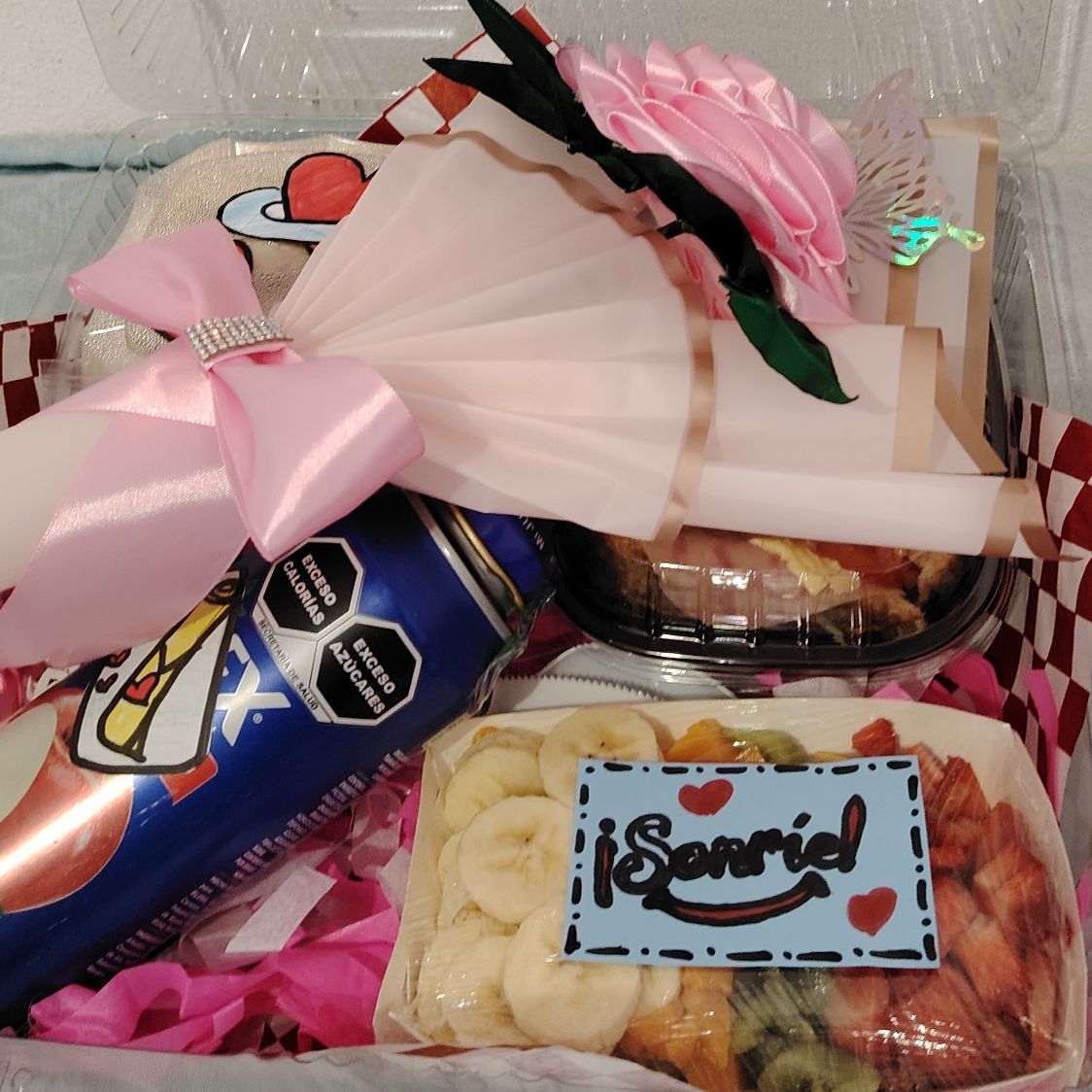 Y rosa eterna colores disponibles :rojo ,rosa,amarilla,blanca 2 ferreos 1 sandwich de pollo 3 panes 3 wafles con frutilla ,platano fresa , manzana lechera 1 jugo de lata mensaje( feliz cumpleaños ) o (te amo )