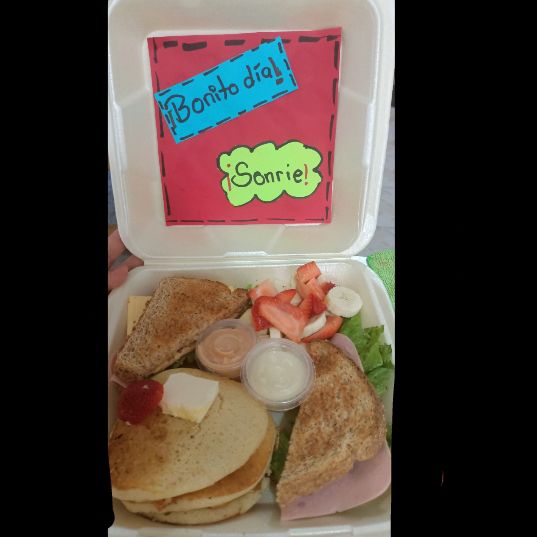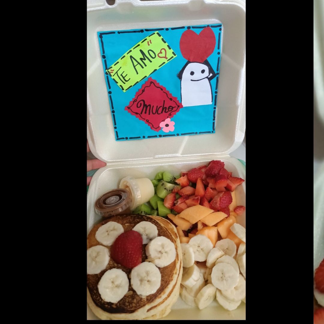 6 hot cakes medianos 1 sandwich: jamón mayonesa,queso manchego,2 jarabes 2 frutas frase: (TE EXTRAÑO MUCHO CORAZON )