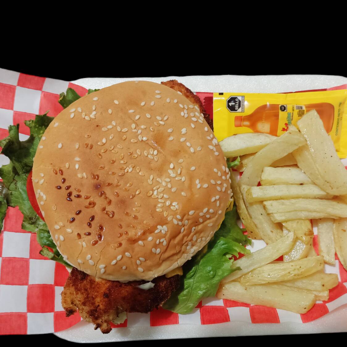 Doble sandwich, mayonesa,jamón, queso manchego , lechuga italiana, jitomate,pollo asado tocino ,orden de papas fritas pequeña ,capsu salsa Valentina, BBQ