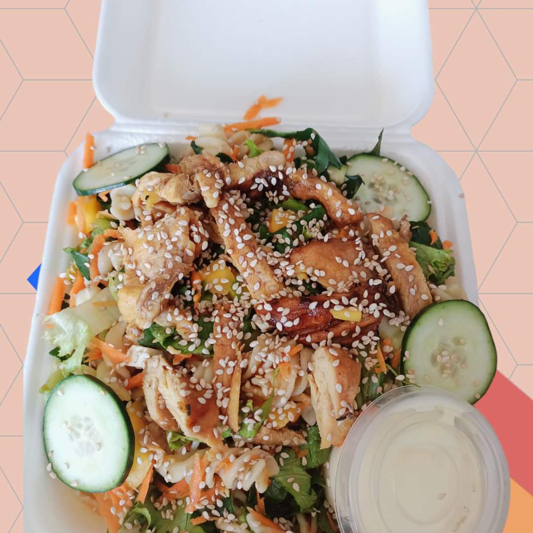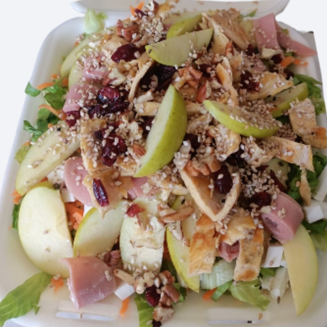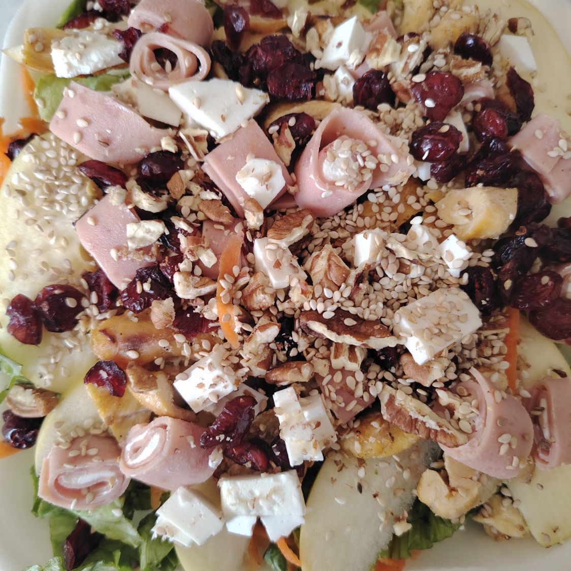 Lechuga zanahoria, queso panela rollitos rellenos de jamón, manzana arándano, nuez y ajonjolí aderezo