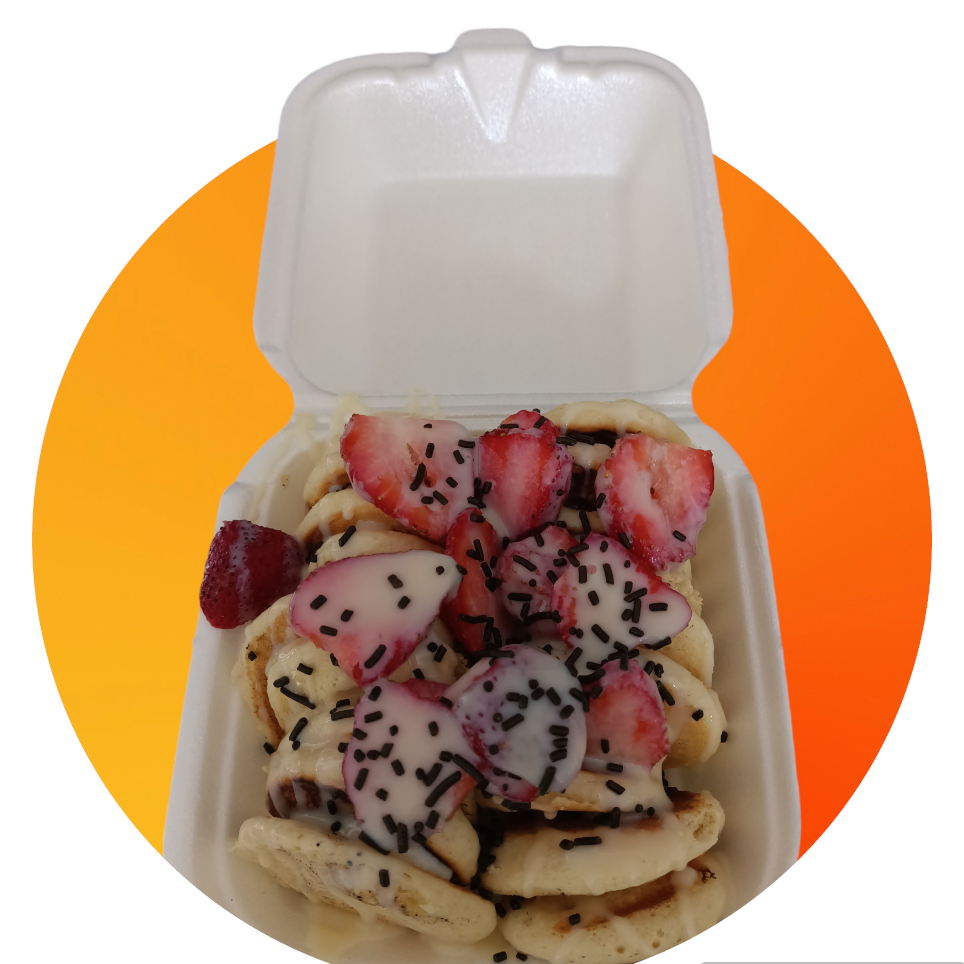 4 piezas de wafles medianas nutella untable platano ,mango manzana ,fresa uva lechera chocolate chispas de colores crema pastelera(porcion para 2 o3 personas )