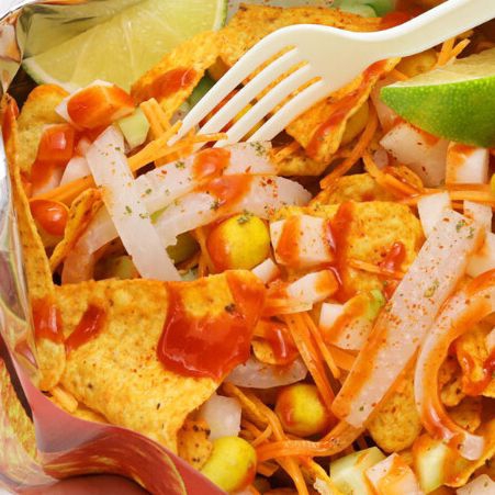 Frituta doritos cueritos pepino picado jicama picada ,zanahoria picada 2 cacahuates 2 gomitas chamoy valentina limon