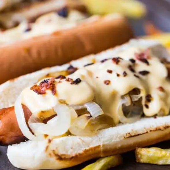 Una pieza de pan Bimbo untado con mayonesa y mantequilla acompañado de salchicha fut doradita y tocino con queso derretido