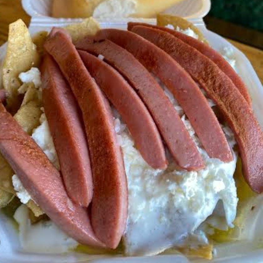 Totopos bañados en salsa acompañando de salchicha doradita con crema queso y cebolla