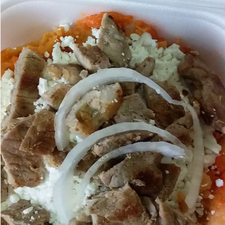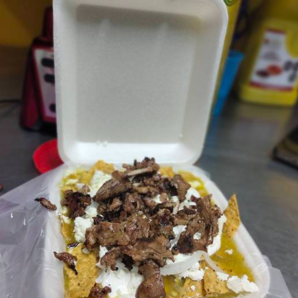 Totopos bañados en salsa roja con bistek doradito acompañado de queso crema y cebolla