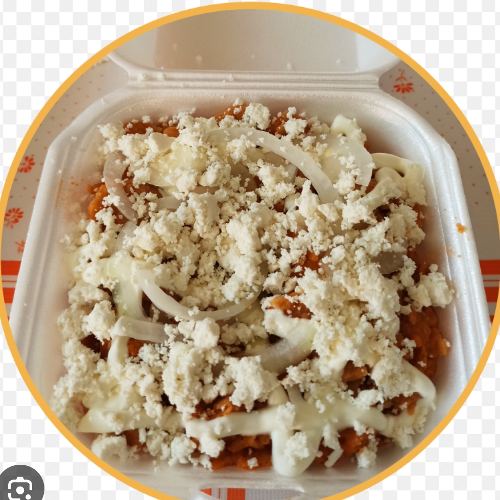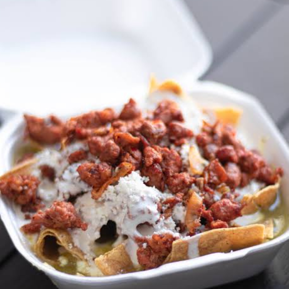 Totopos bañados en salsa acompañando con longaniza doradita cebolla, queso, crema