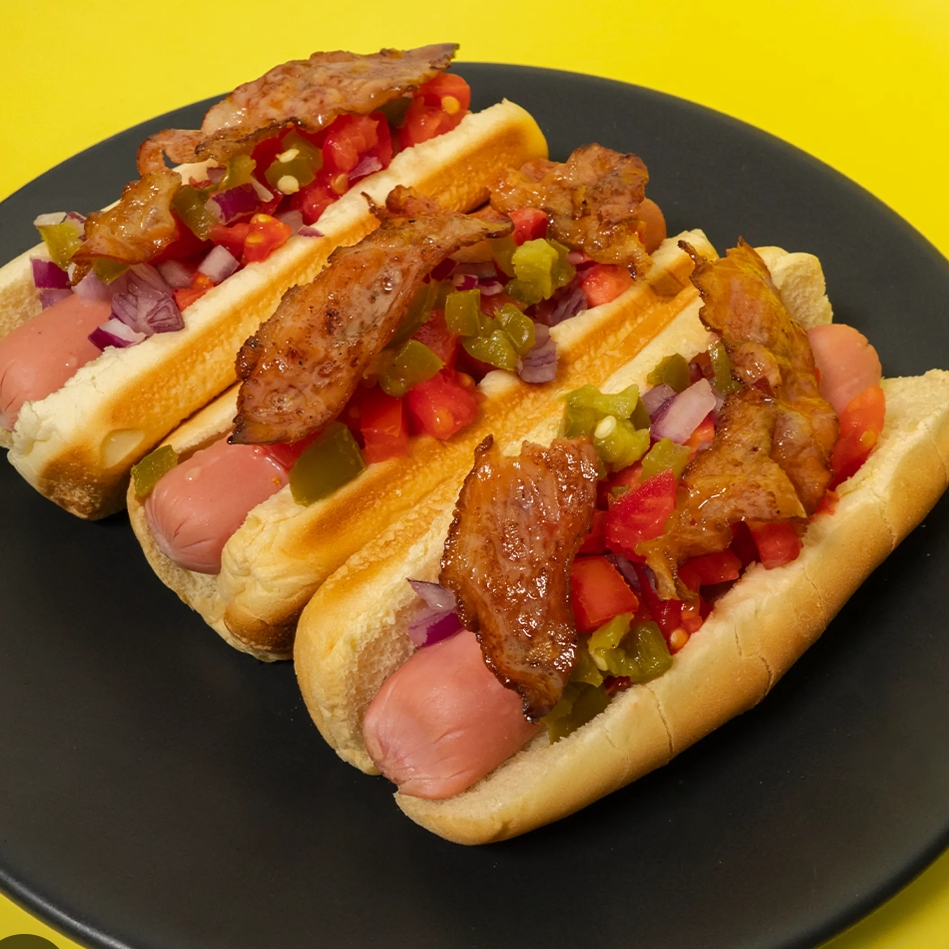 3 piezas de pan Bimbo acompañado de salchicha fut doradita y tocino tostado (mayonesa, mostaza, catsup)
