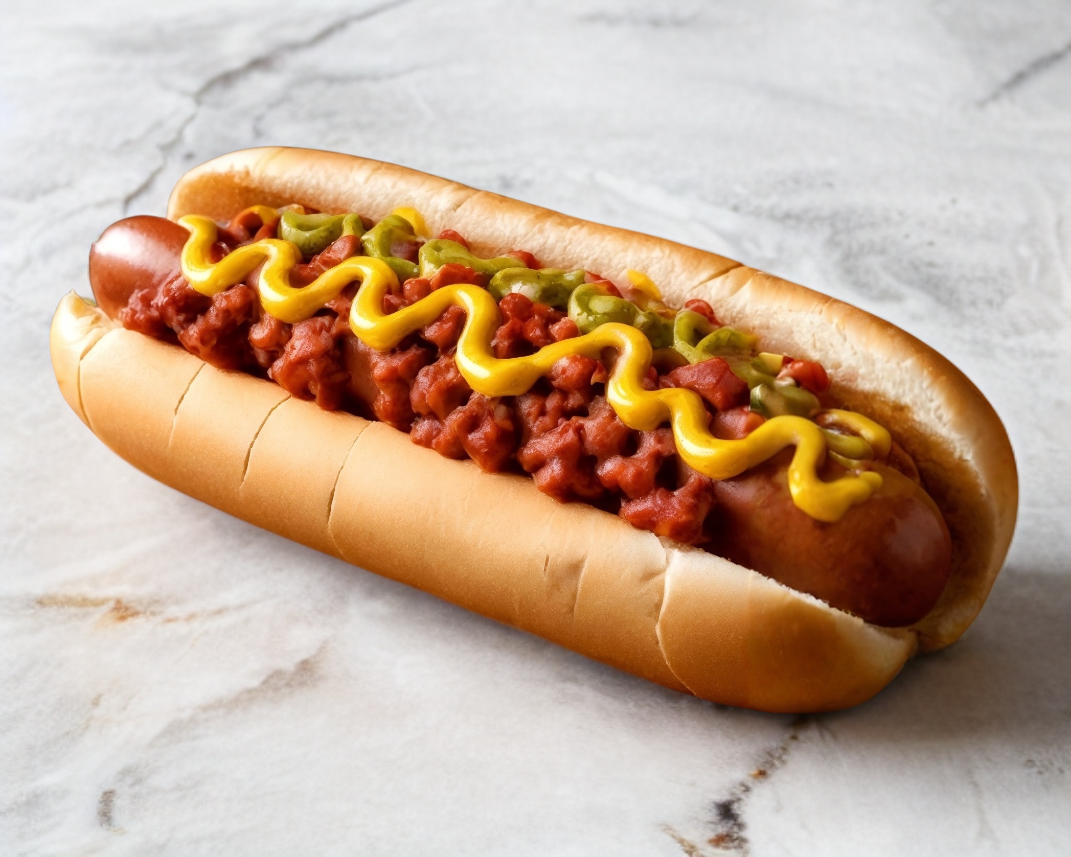 Salchicha, cebolla caramelizada, chiles de tu elección, mayonesa, cátsup y mostaza.