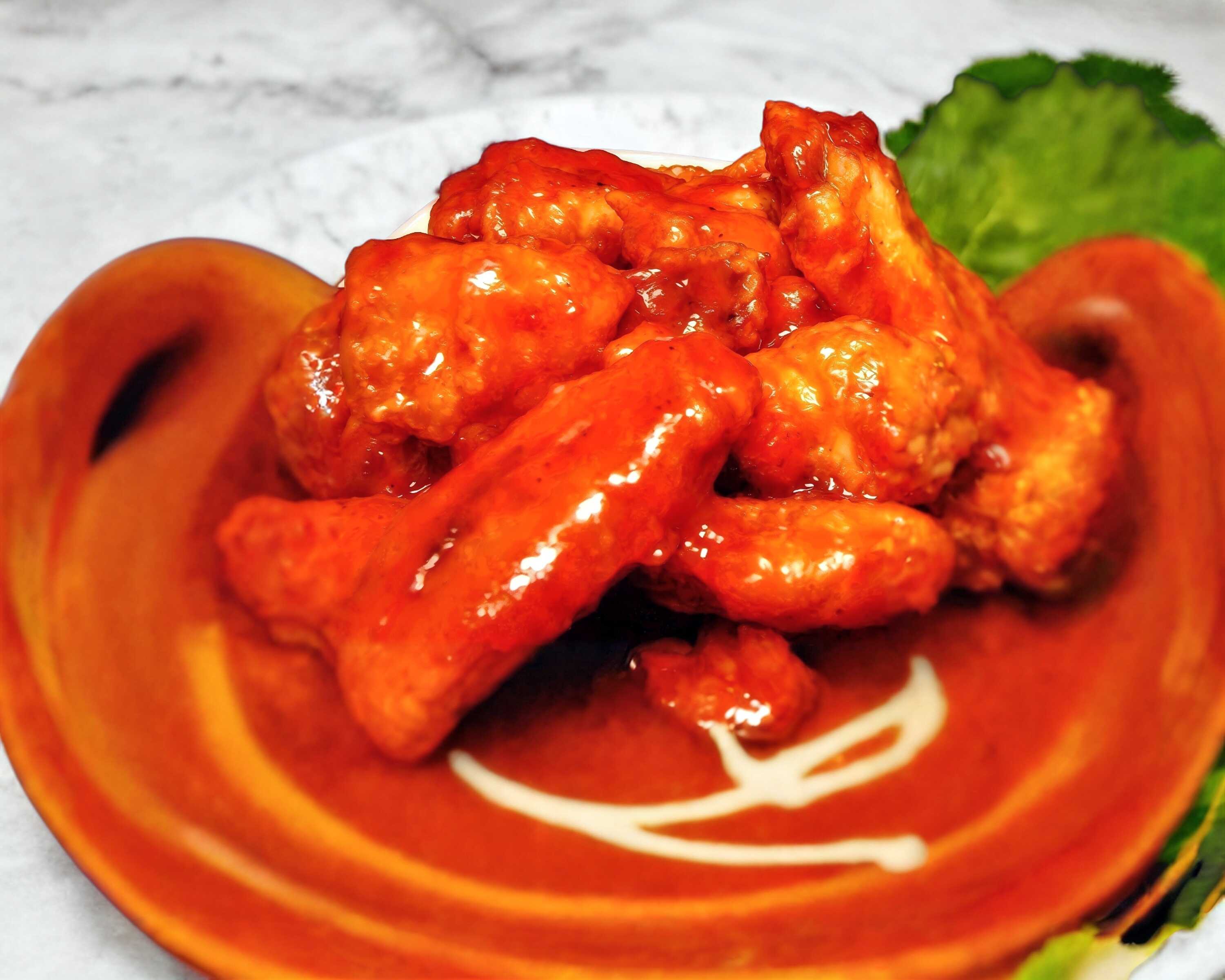 Alitas bañadas en salsa buffalo.