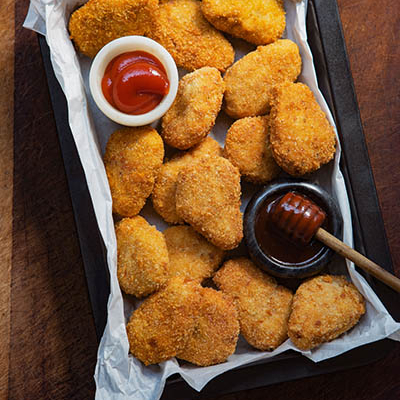 CRUJIENTES NUGGETS DE POLLO 11O GRS, SOBRE UNA CAMA DE LECHUGA ACOMPAÑADOS DE SALSA DE TU ELECCION