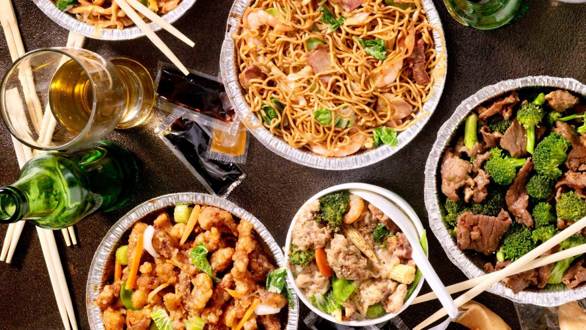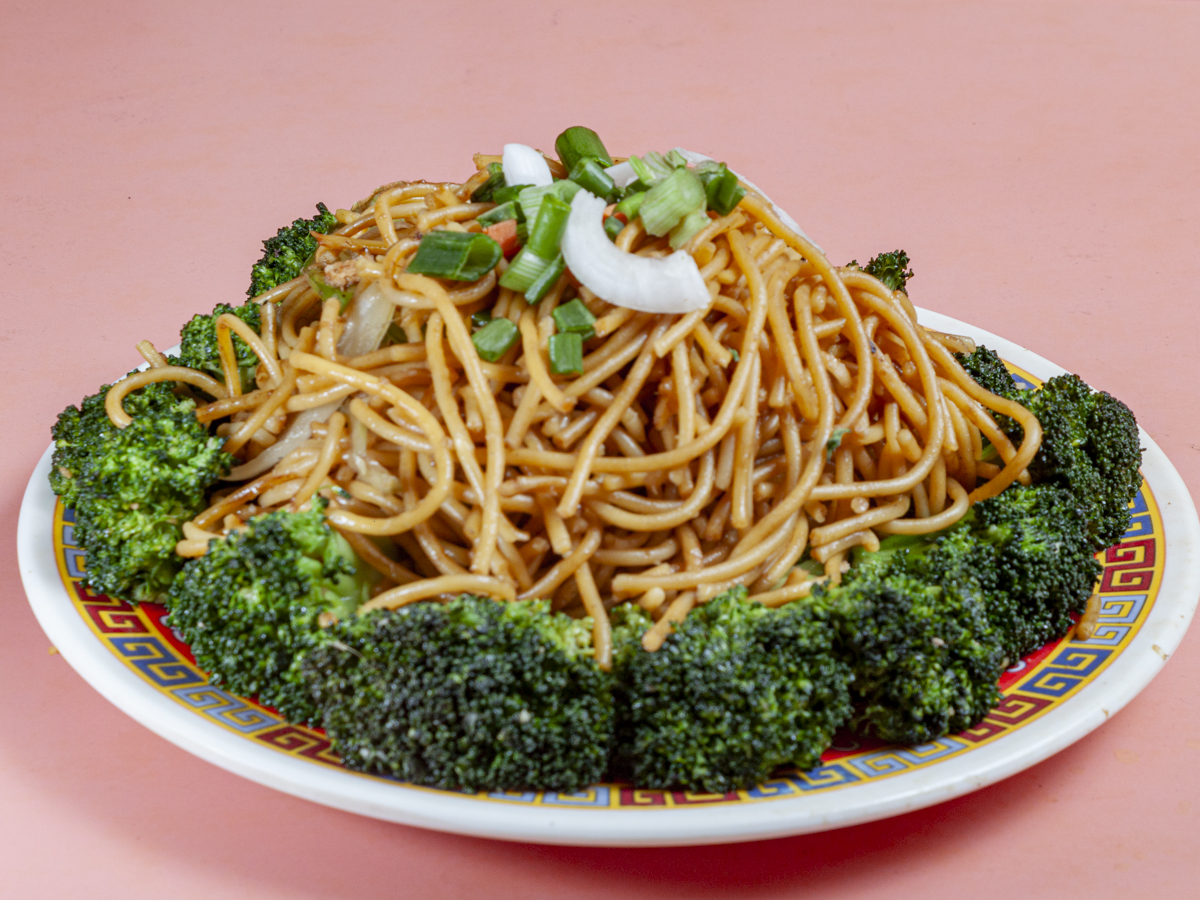 Pasta china preparada con brócoli y carnes mixtas (pollo, cerdo y camarón)