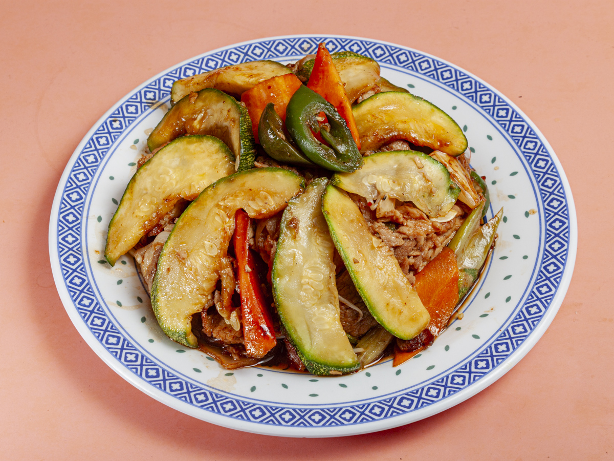 Calabaza y combinación de verduras con bistec preparados en salsa de ostión
