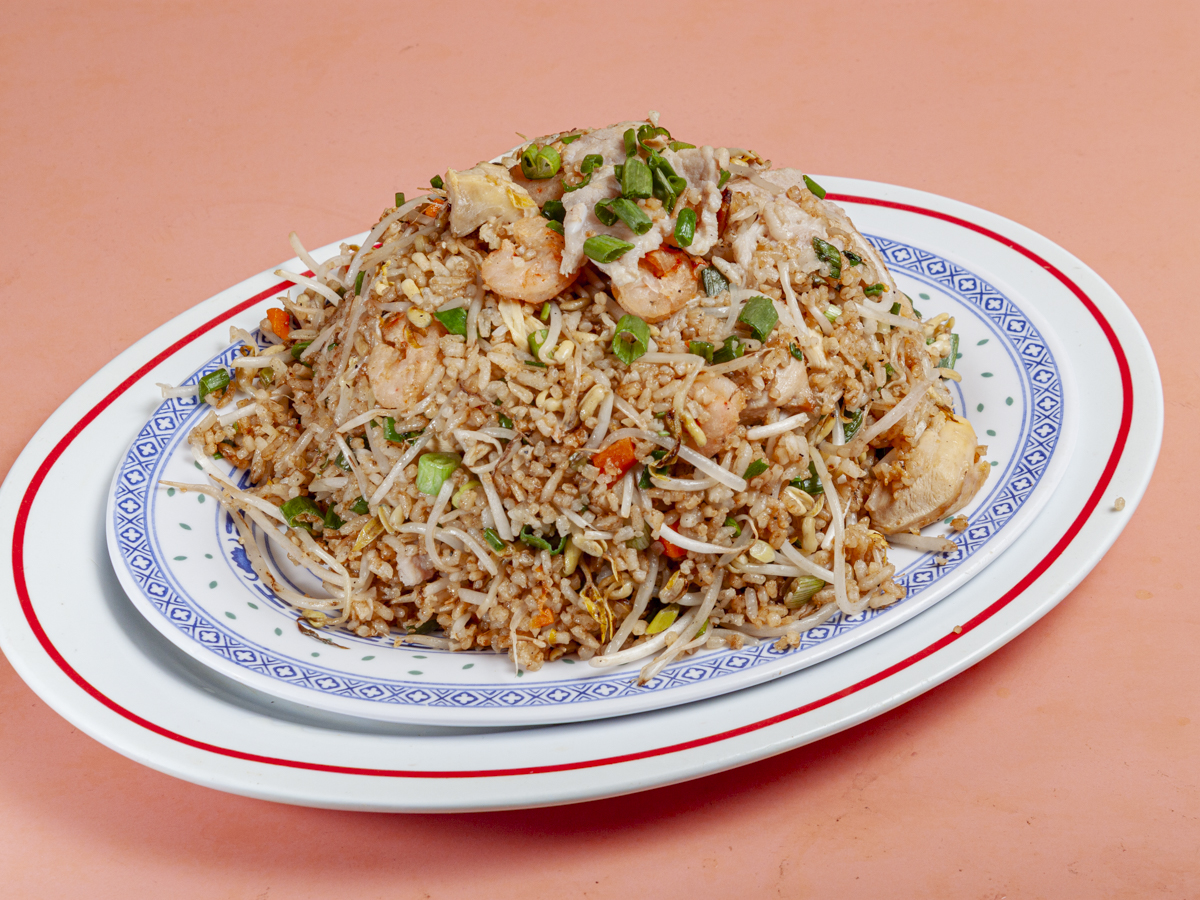 Arroz frito preparado con salsa soya, pollo,cerdo y camaron.