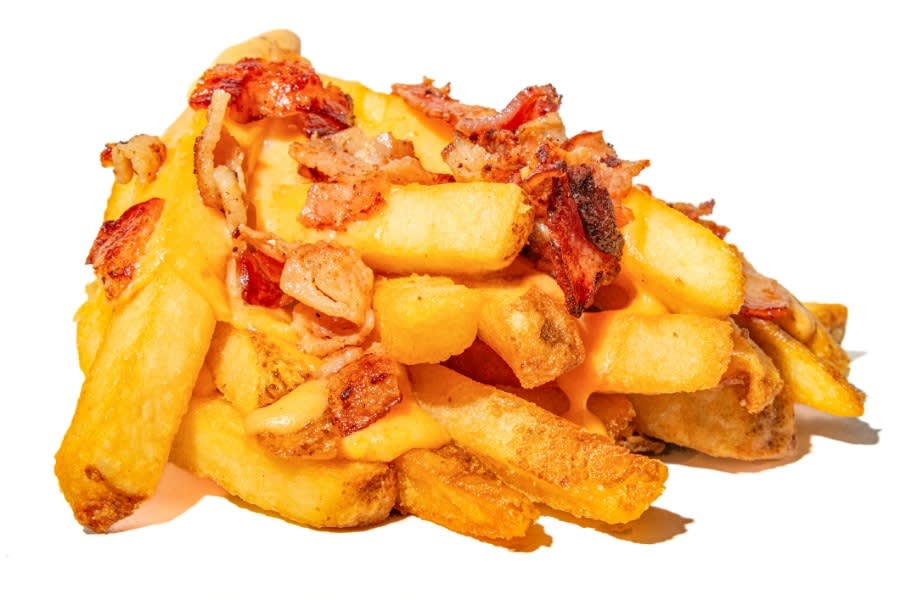 Papas cubiertas con queso americano, aderezo de ajo y mermelada de tocino. 330g.