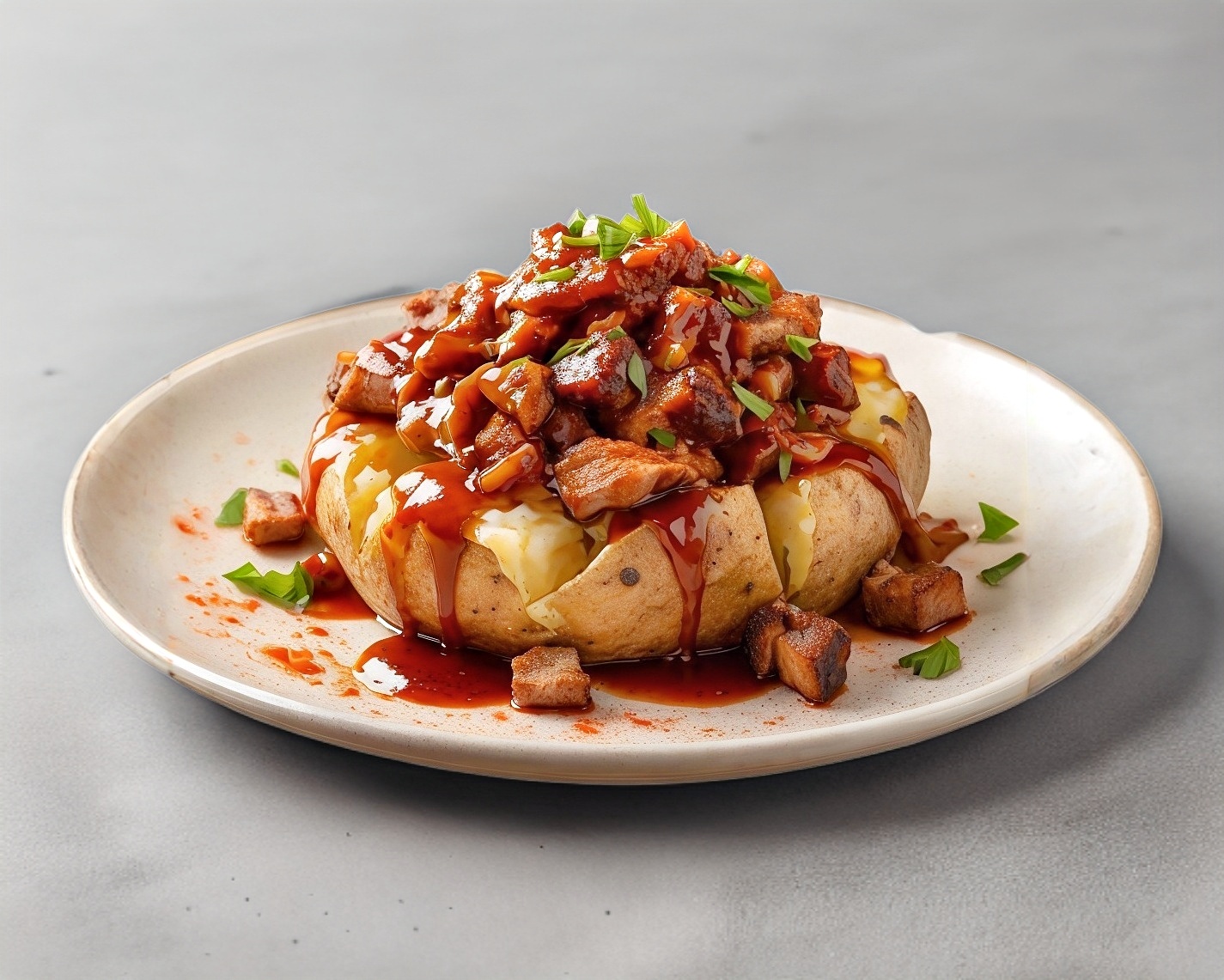 Papa de la más alta calidad al horno, con el delicioso pulled pork encima y un toque de BBQ.