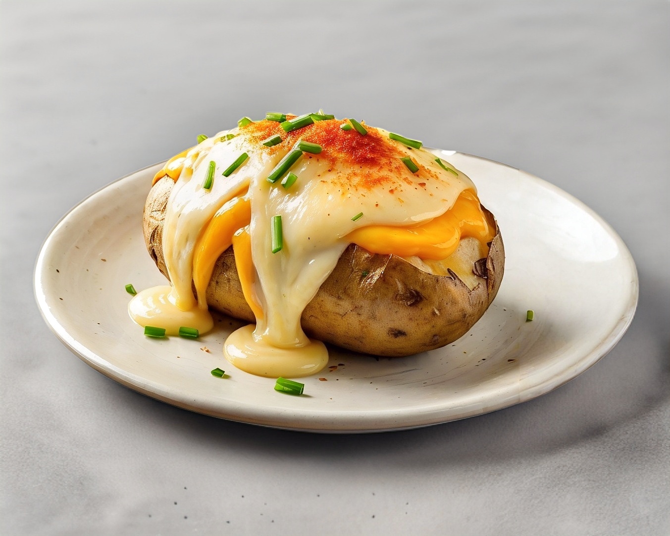 MEDIA papa frita de la más alta calidad al horno, preparada relleno especial de queso y tocino con un toque de cebollín.