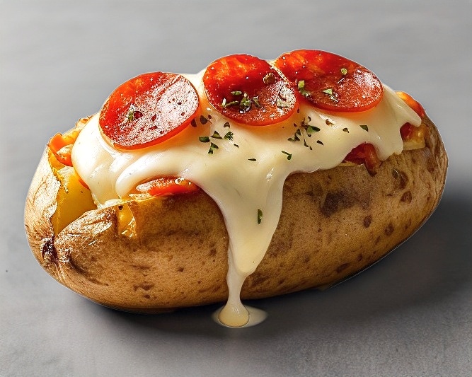 Papa de la más alta calidad al horno, preparada con salsa de tomate, pepperoni y mozarella gratinado.