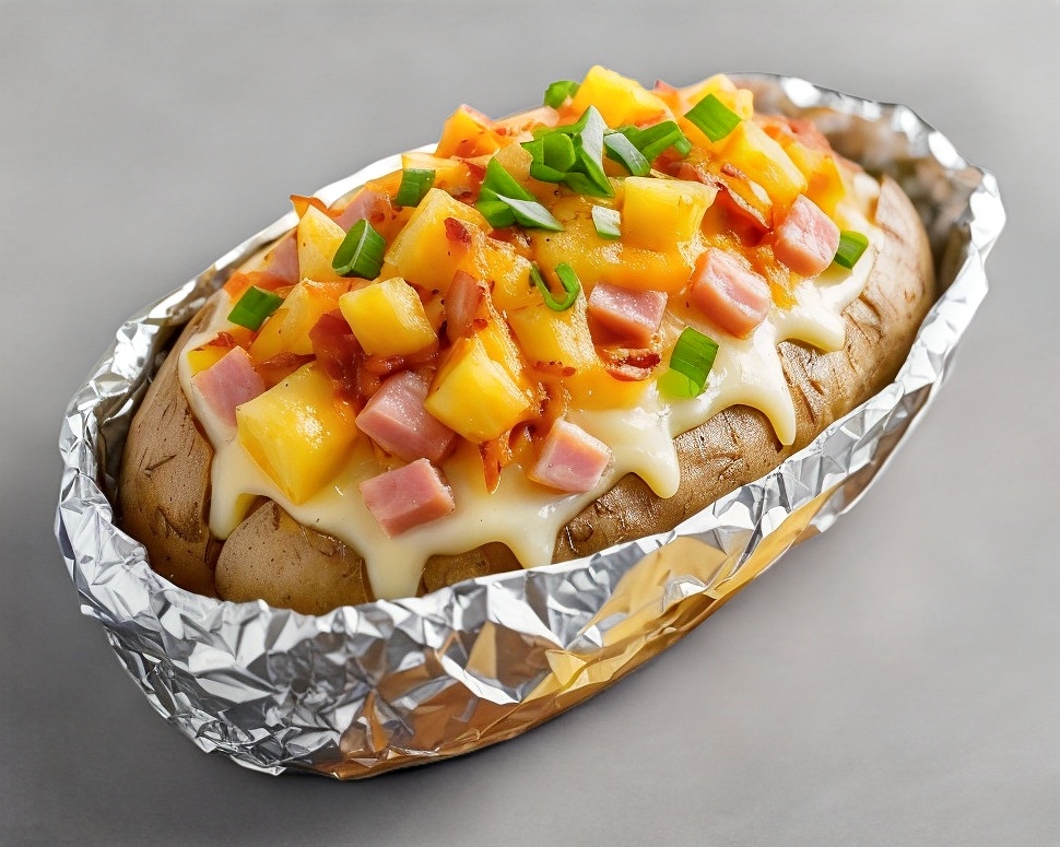 Papa de la más alta calidad al horno, jamón en cuadritos, piña asada y queso mozarella en cuadritos.
