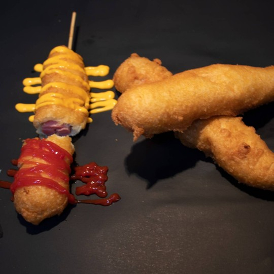 Salchicha Capeada en Forma De Espiral, Capsu, Queso y Salsa