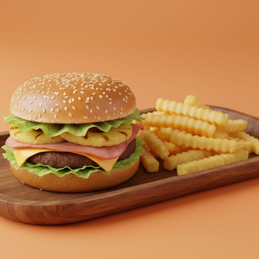 Hamburguesa Hawaiana, Papas Gajo Y Refresco