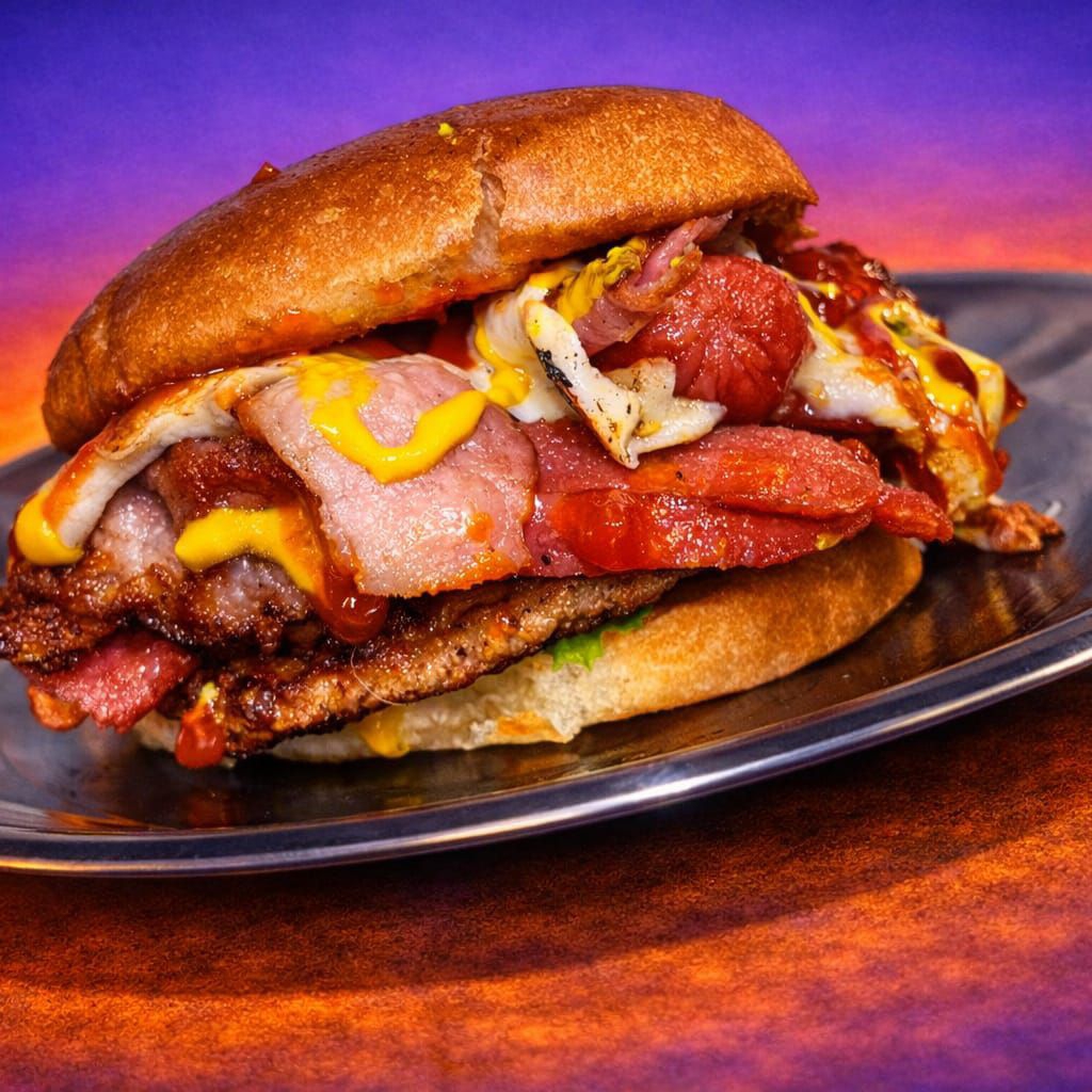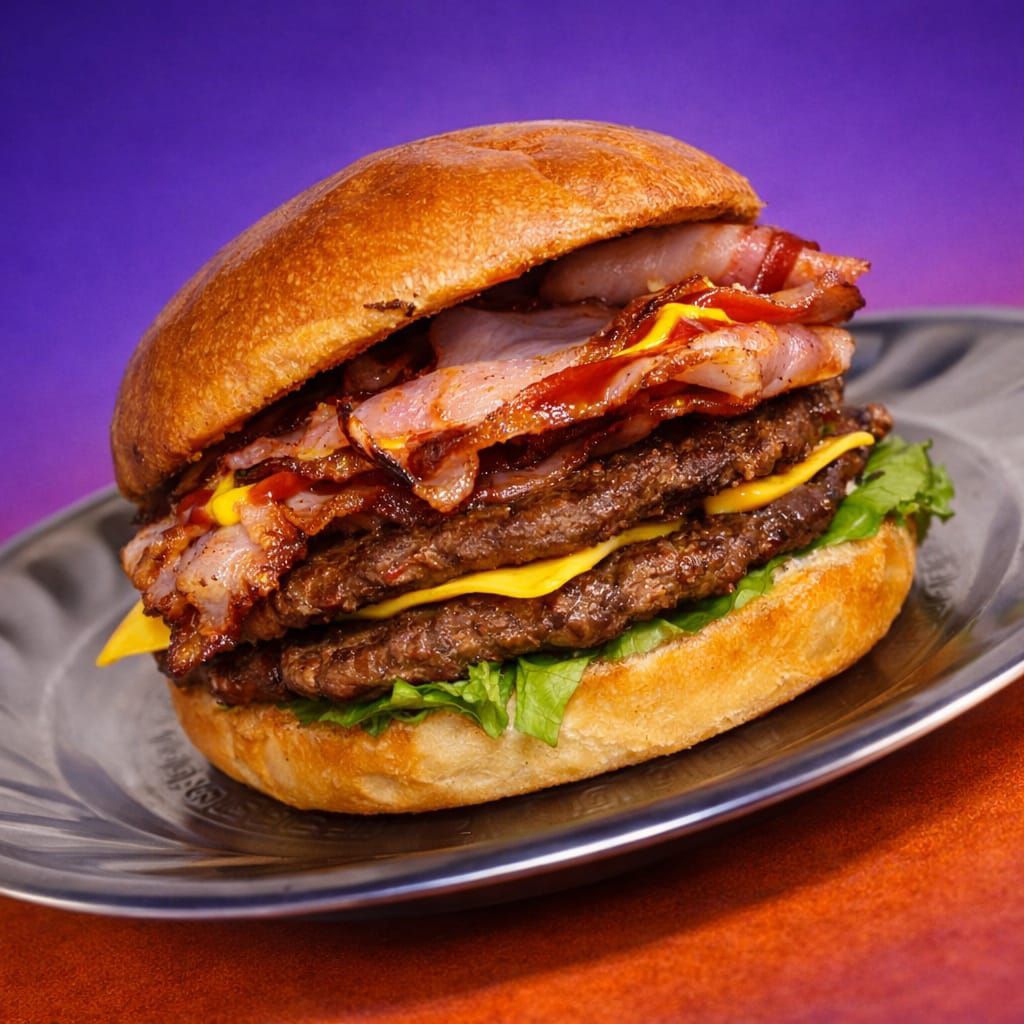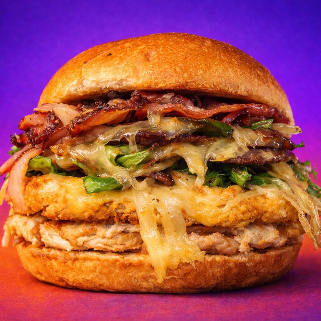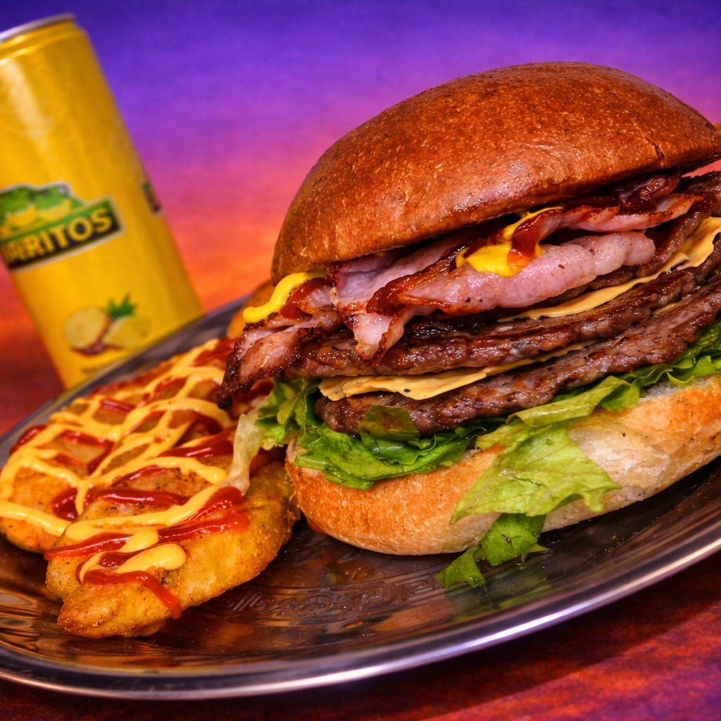 220 gr de carne, 100 gr de tocino, pollo, quesos, pierna, bollo especial y aderezo Co.