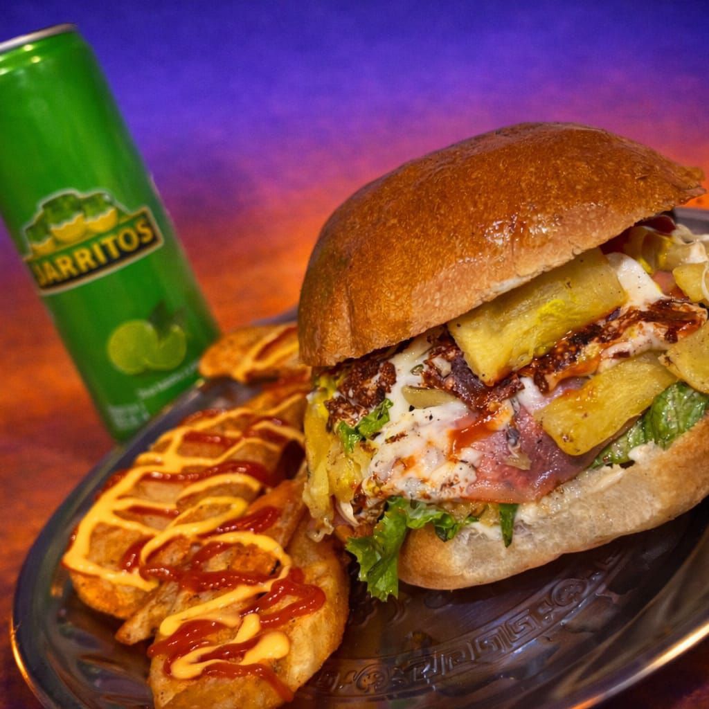 Hamburguesa Con Pastor, Queso Fundido Y Aguacate.