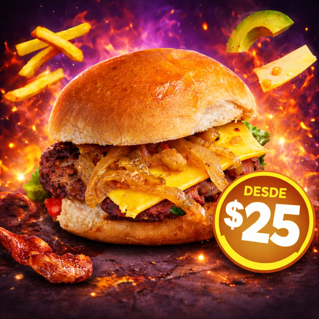 Jugosa carne preparada en casa (80 g) servida en suave pan brioche, con queso americano fundido, cebolla caramelizada, lechuga fresca. Una combinación equilibrada de sabores que siempre se antoja.