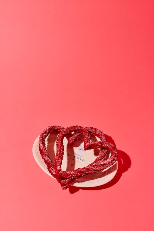 Churros sabor red velvet con azúcar de chocolate blanco.