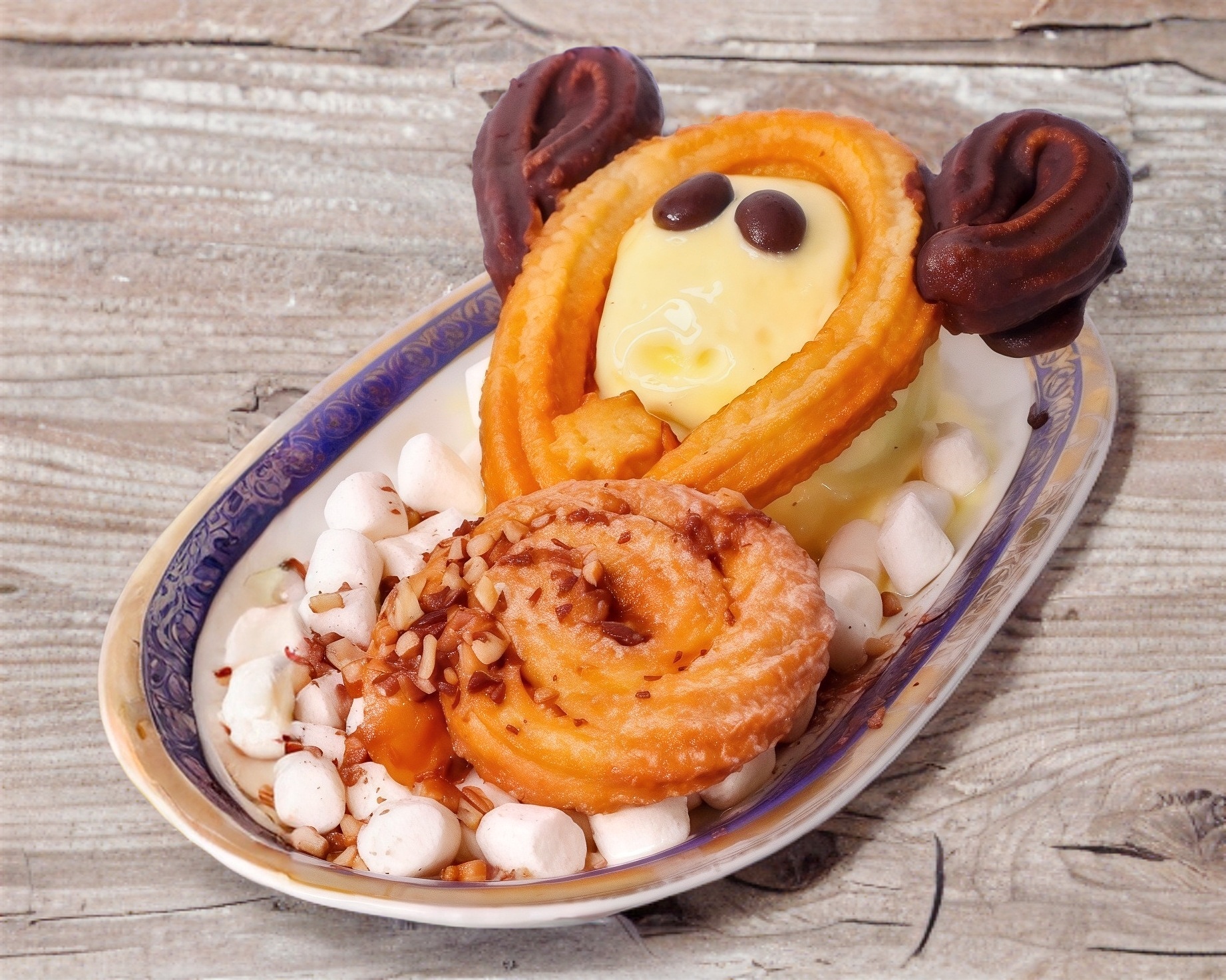 Figura de tlacuache con orejas de chocolate, cola de tlacuache de churro + bombones + 1 bola de helado