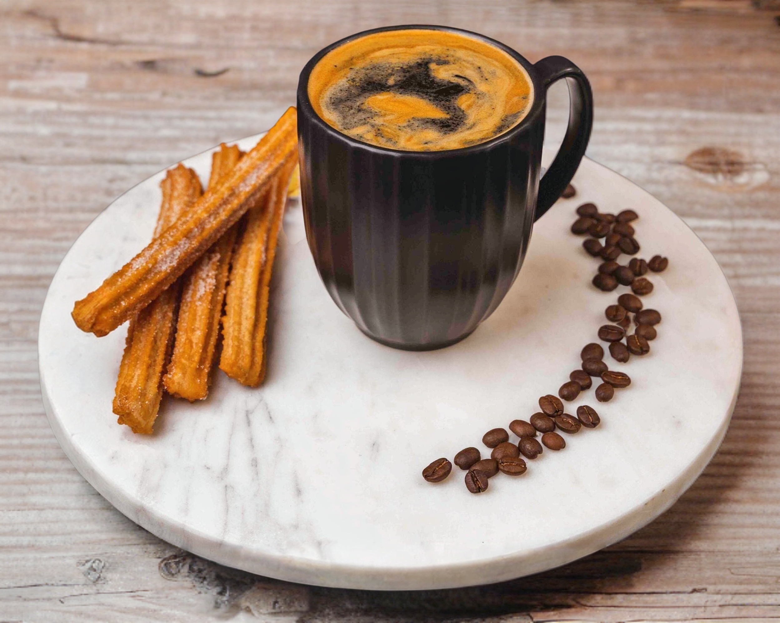 Incluye 4 churros tradicionales recién hechos, doraditos por fuera y suaves por dentro, espolvoreados con azúcar y canela, acompañados de un café del sureste de 12 oz, aromático y con cuerpo, ideal para complementar el sabor.