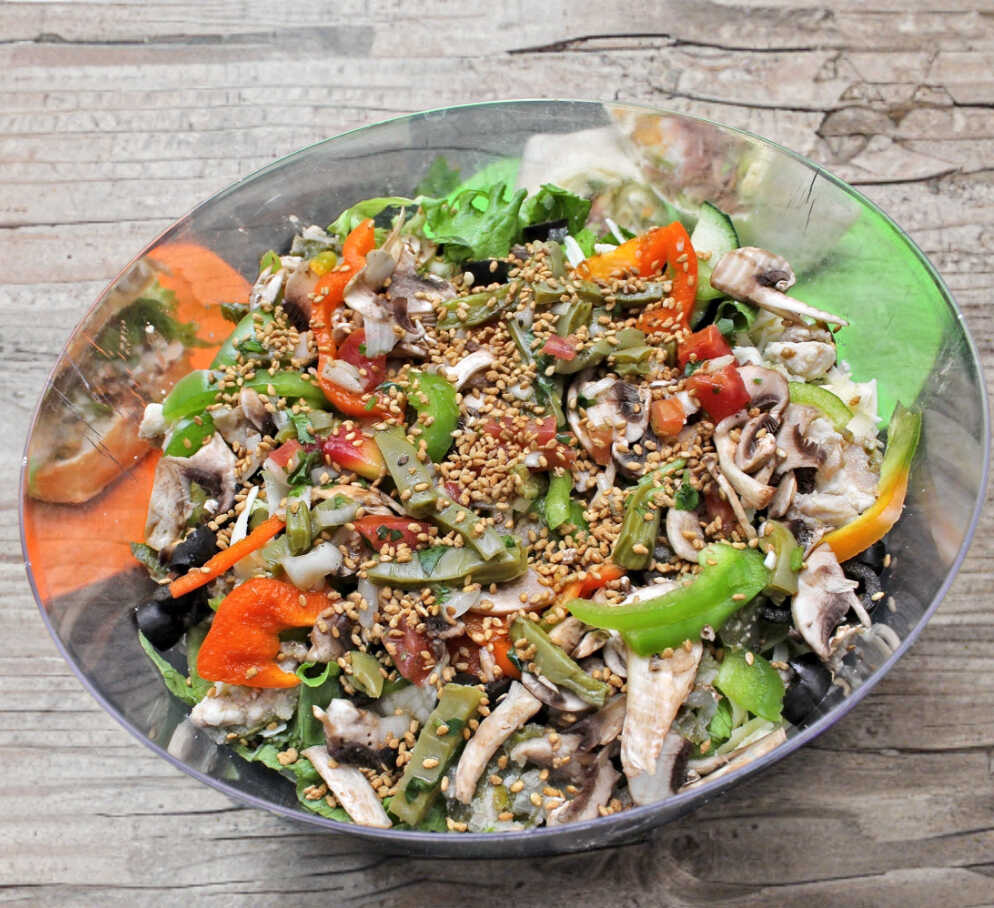 Base de lechugas mixtas más 2 proteínas, 3 complementos vegetales, 1 aderezo y 2 semilla o crujiente.