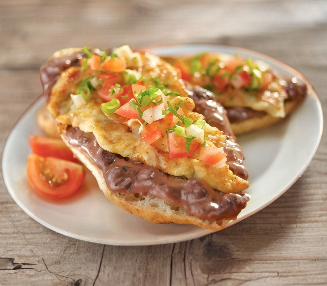 3 Piezas de molletes acompañados de pico de gallo. Incluye jugo o fruta y café.