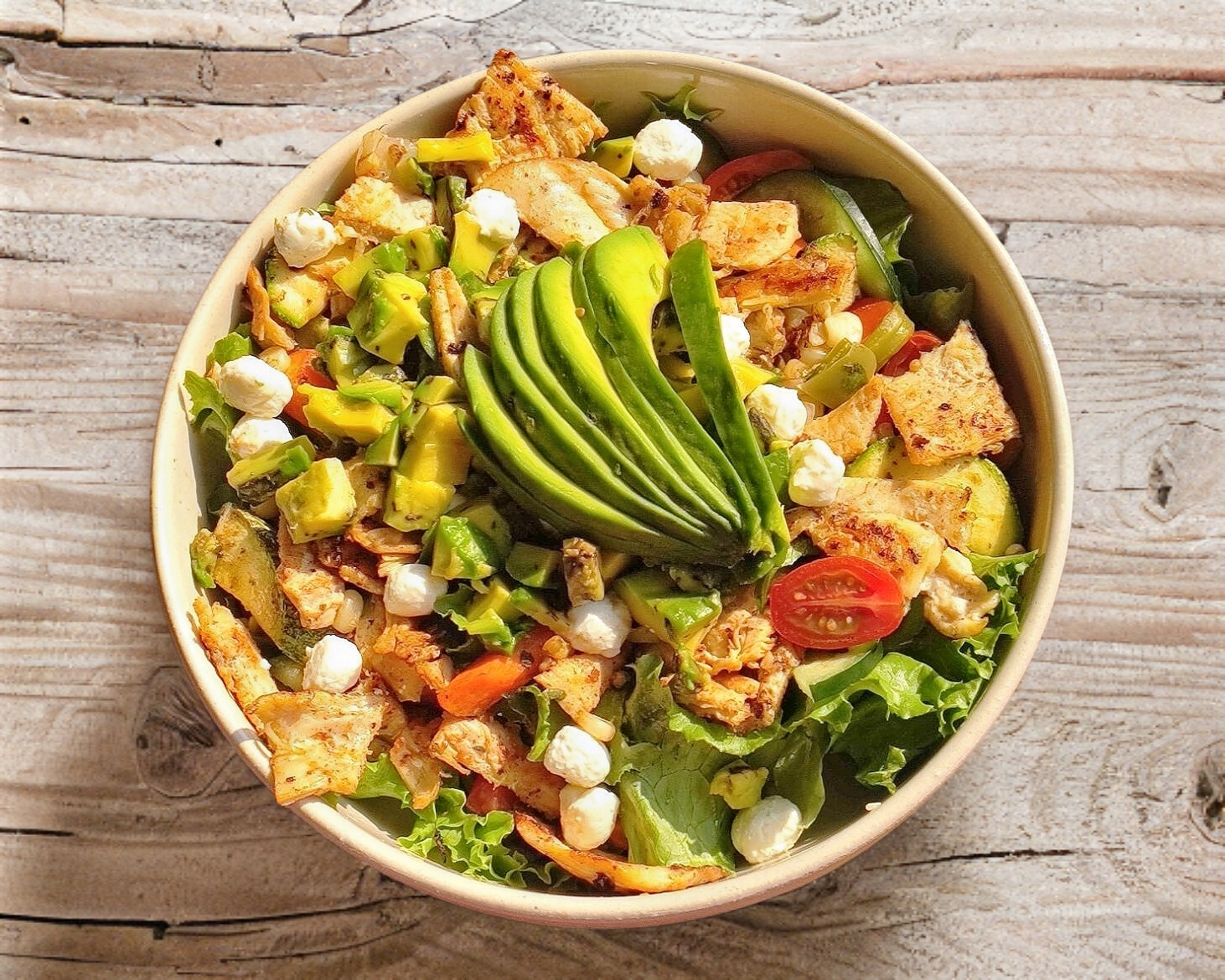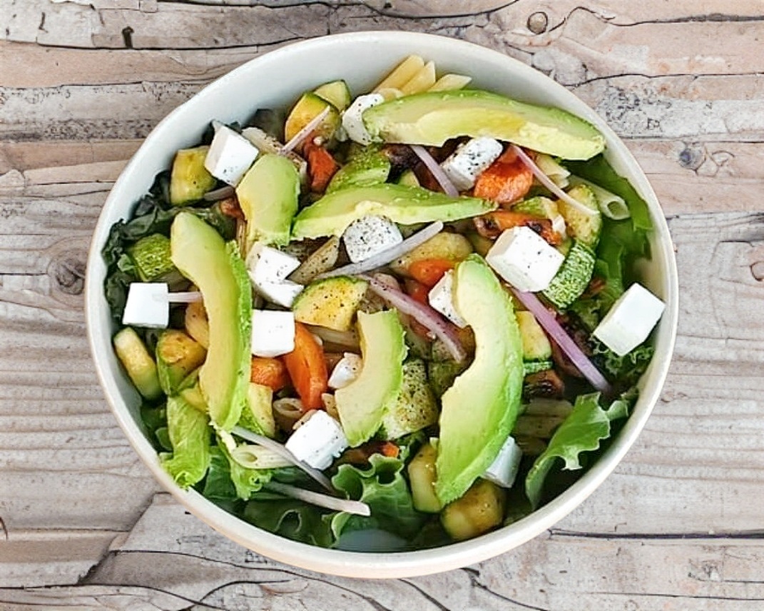 Mix de lechugas, pasta cocida, pechuga de pollo asada, zanahoria, calabaza, aguacate, cebolla, queso canasto y aderezo de crema especiado Mérode.