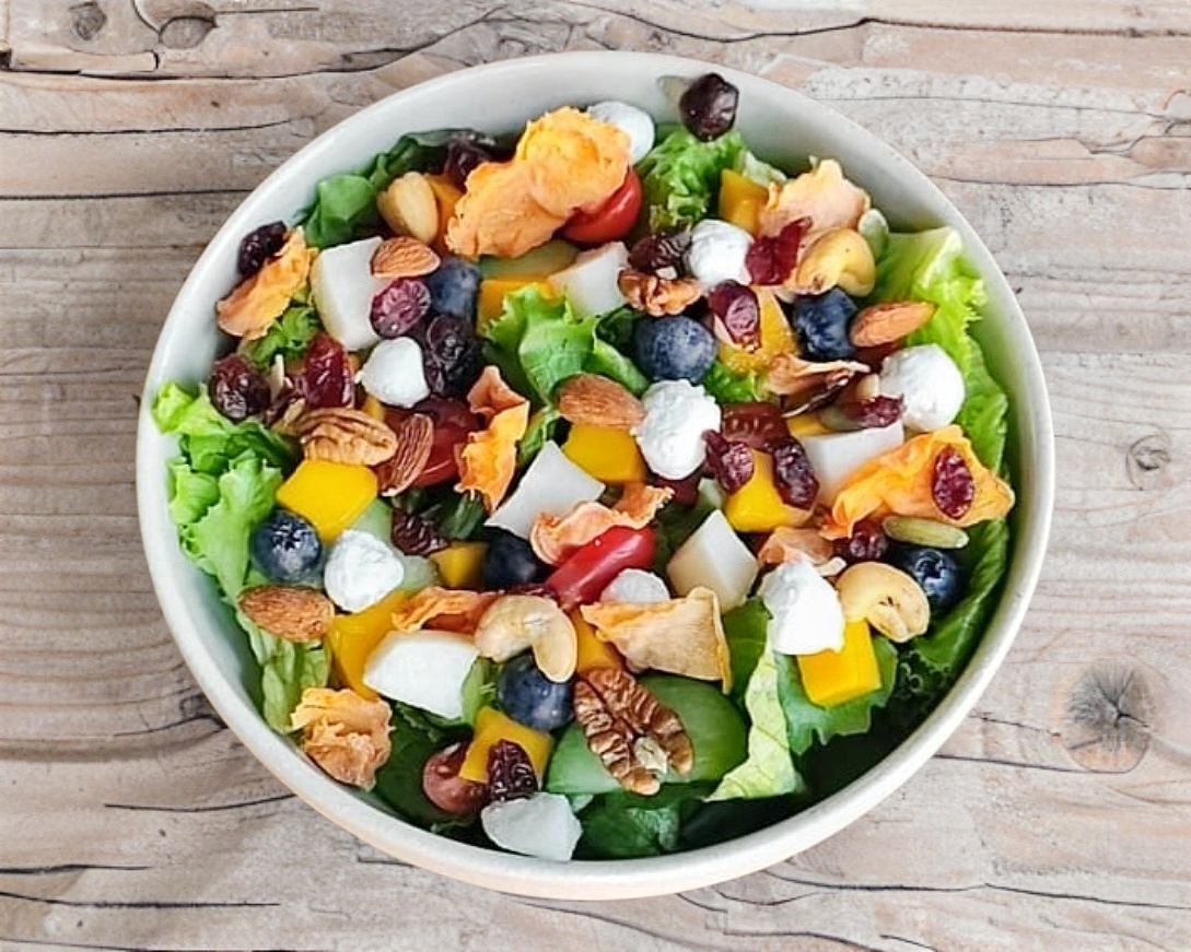 Mix de lechugas, pepino, jitomate, jícama, fruta de temporada, pechuga de pollo asada, mix de semillas, queso de cabra, chips de camote, vinagreta Mérode de frutos rojos.