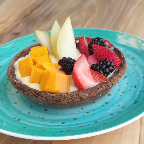 Rellena de crema pastelera deslactosada hecha en casa y fruta de temporada.