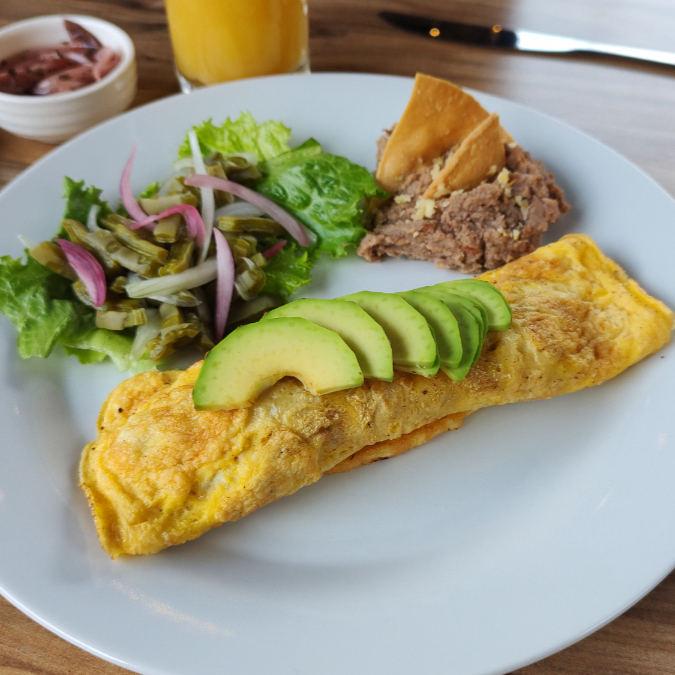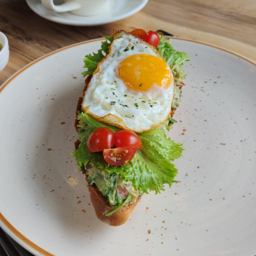 Pan artesanal tostado, cubierto de guacamole tradicional, jitomate y proteína.