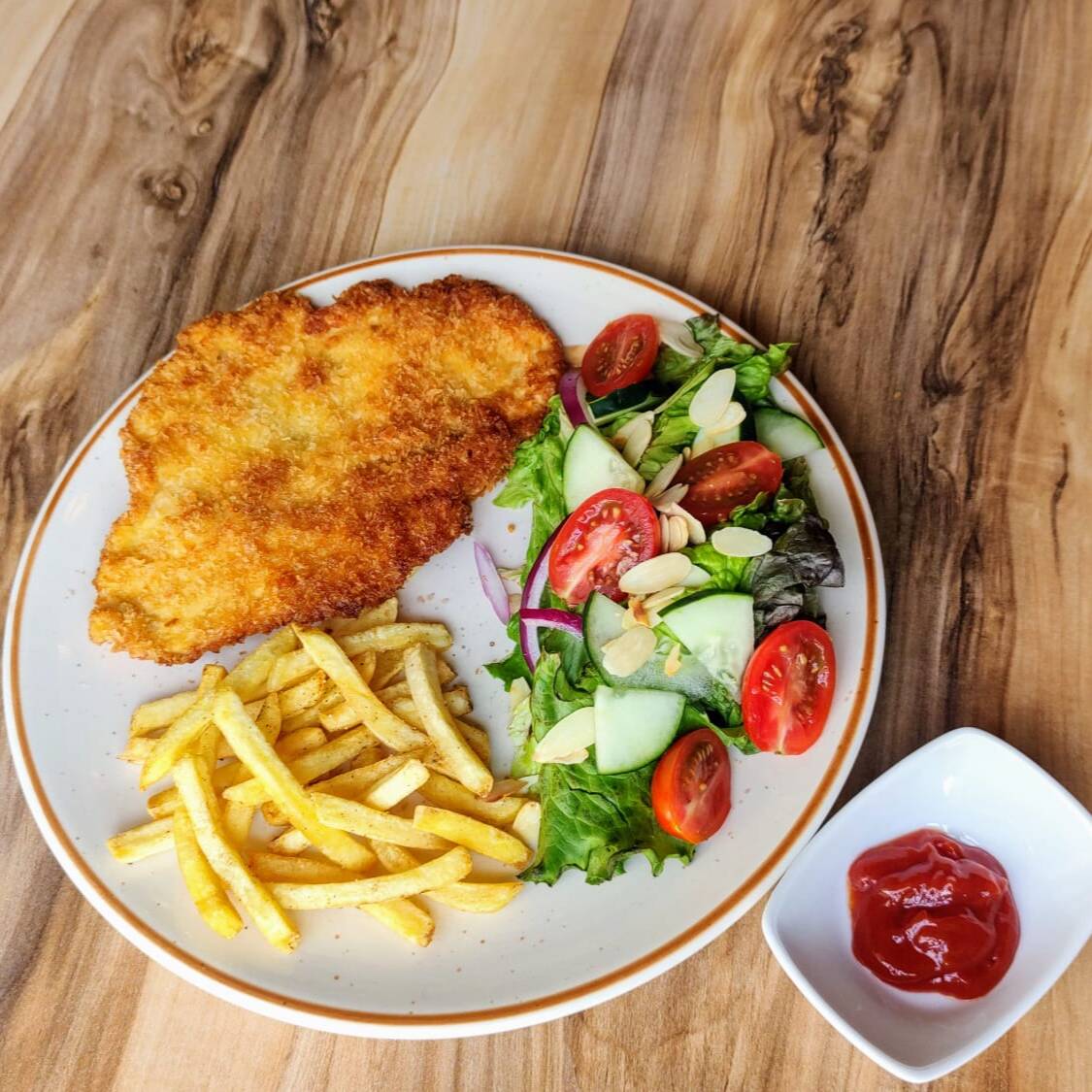 Milanesa de pechuga de pollo empanizada, acompañada de ensalada fresca y papas a la francesa.